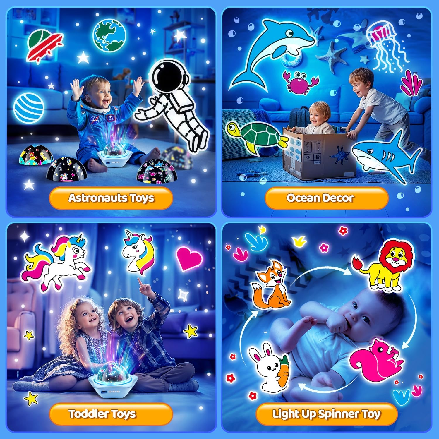 - COOL Star Projector with Vivid 6 Films: The Star Projector for kids toys is made with vivid 6 theme, Including girls like unicorns,star moon;boys like dinosaurs & astronauts and children all like oceans,animals.Star projector for kids toys can produce 72 types of light shows,clear projection lighting effects to make kids rooms is transformed into a Nighttime Wonderland, kids night light projector for kids toys, dinosaur toys for boys, unicorn gifts for girls!Cool star design make star night light projector can 360° rotate for bedroom quietly!A very cool&unique star projector for kids projector night light for kids Christmas gifts,Sensory toys for kids,ceiling projector night light for kids.
