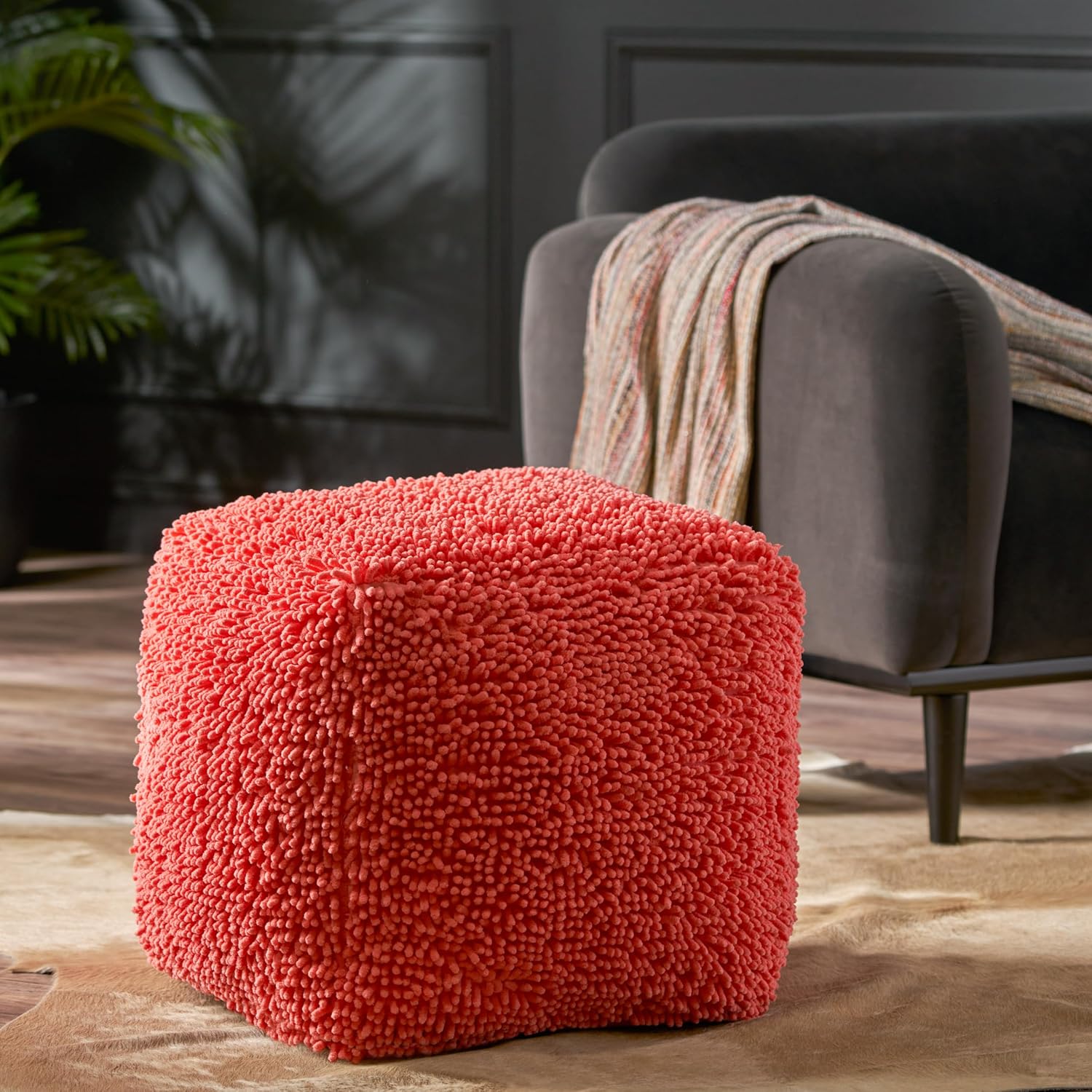 GDFStudio Modern Microfiber Chenille Cube Pouf Ottoman Foot Stool - Bean Bag Floor Chair - Foot Rest Couch for Living Room Bedroom,Coral,16"" x 16"" x 16"", Statha,coral, 314105N