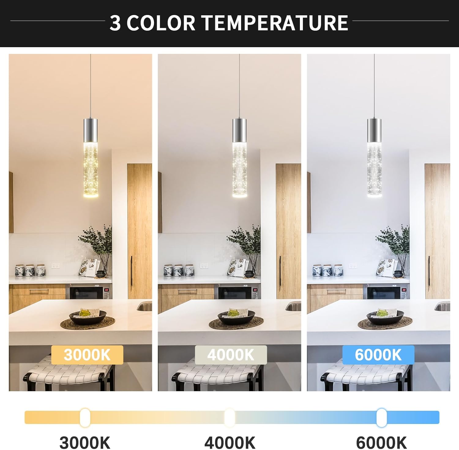 - [Adjustable 3cct Pendant Lights]: Pendant Light Fixtures color temperature can be adjusted 3000K 4000K, and 6000K.You can also use the control button to quickly switch the light color (cool white light, neutral light, and warm white light).