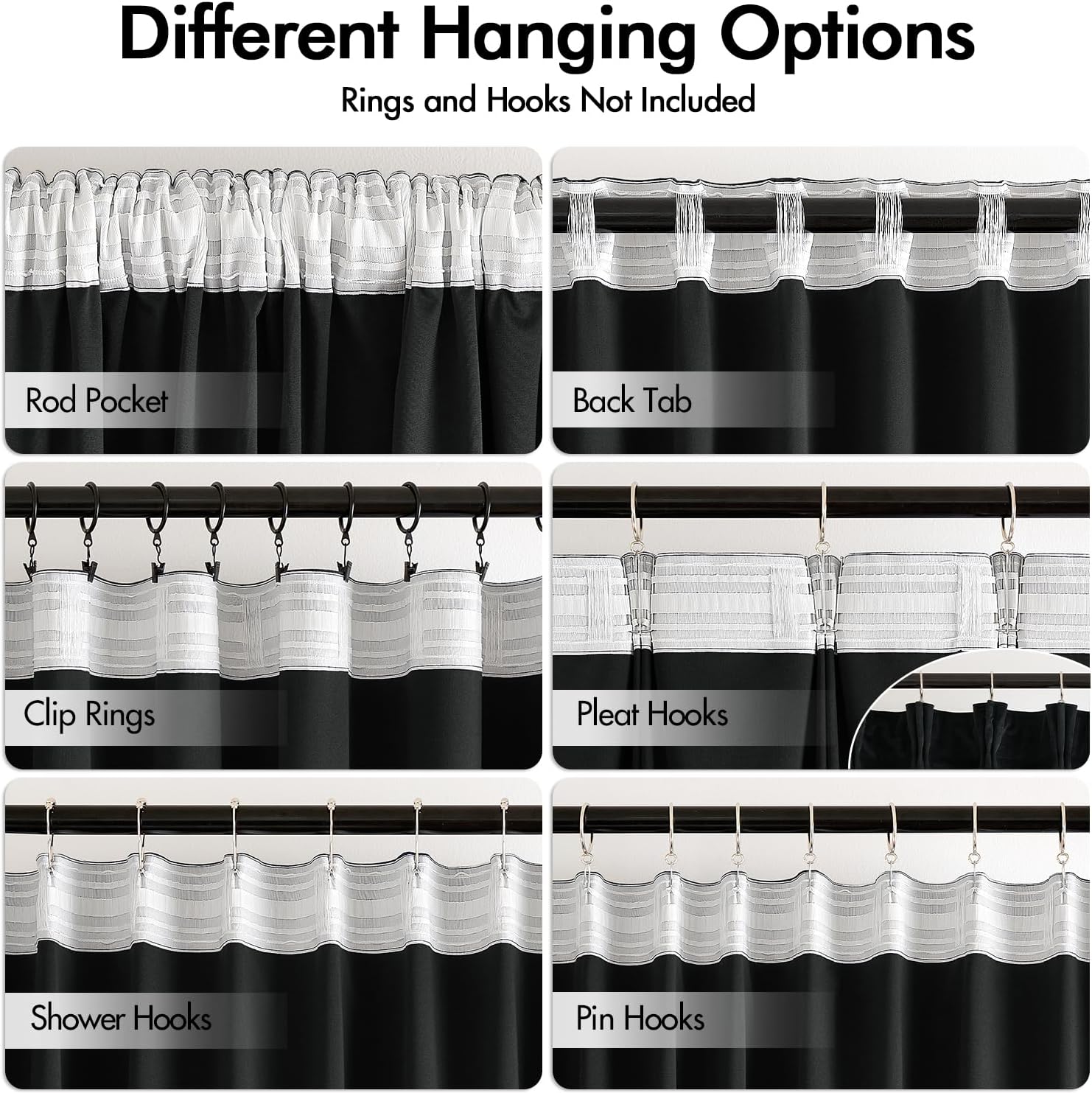- HANGING OPTIONS: Each curtain panel has 3-in-1 top style design: rod pocket, back tab and pinch pleat. Back loop (2.3 inch) and rod pocket (3.1 inch) fit most standard rod. Curtains also can be hung with clip rings or curtain hooks. 3 ways to meet your various needs.