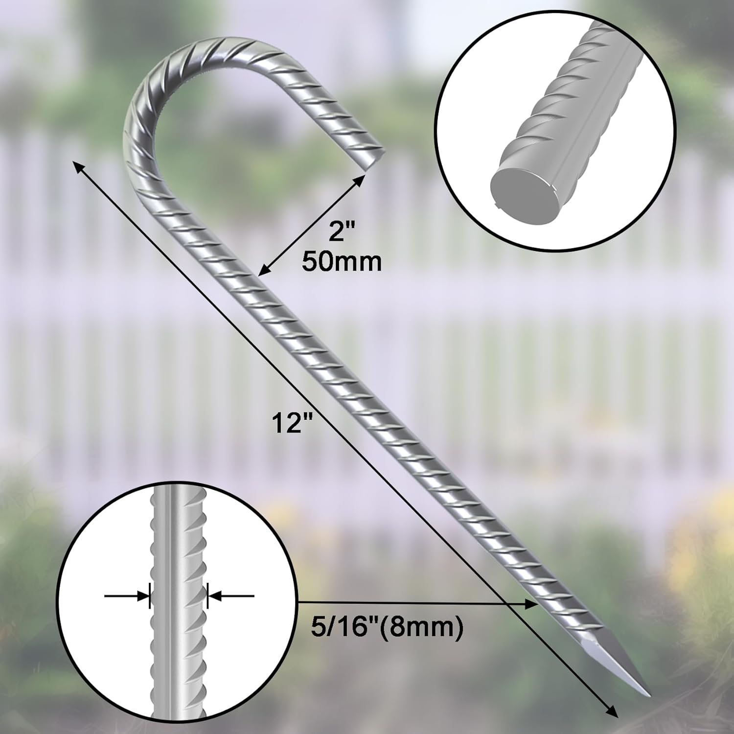 - Innovative J-Hook Design: Sold in bundles of 30 pieces. Each stake features a 5/16-inch (8mm) diameter J-hook design with 2-inch hook spacing, providing a secure and firm hold in the ground. Whether securing tents, chain-link fences, garden decorations, or large inflatables, our rebar stakes 12 inch ensure reliable stability even in high winds or harsh weather conditions