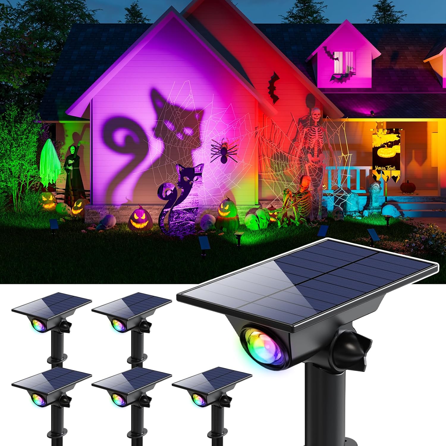 6 Pack Color Changing Solar Power Spot Lights for Halloween Decorations, Skeletons, Tombstones, Ghost, Outdoor Waterproof LED Landscape Spotlight Lamp for Outside Yard, Tree, Flag, Garden, Statues
