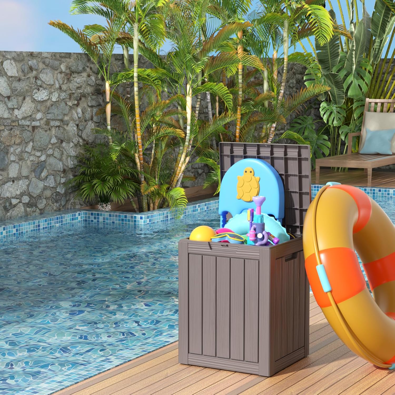 - BEAUTY MEETS DURABILITY: Featuring an aggregate resin with a wood grain pattern, this resin deck box offers an appealing look coupled with robust protection. It's resistant to water, UV rays, fading, rust, peeling, and warping, making maintenance nearly unnecessary for the coming years