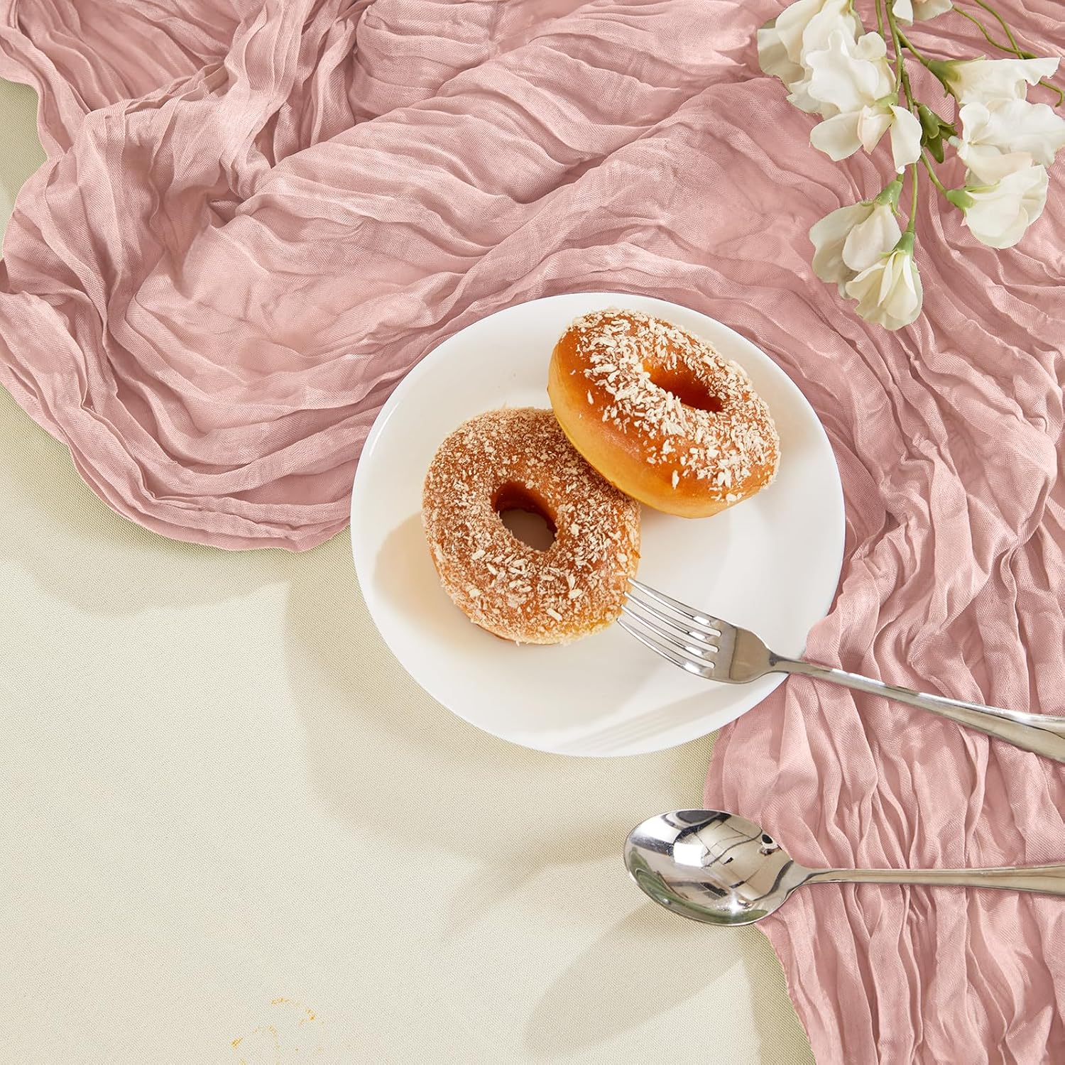 - PACKAGE INCLUDED: You will receive 6PCS dusty pink cheesecloth table runner. Elegant and beautiful design, exquisite workmanship. Product size: Each boho table runner is 35 x 120 inches. Enough to cover rectangles and round tables, as well as long tables that are stitched together. It can even be used to belt chairs or decorate table scarf, background curtains or even gift wrap. Round or square tables for 8-10 people, perfect for romantic and elegant party events