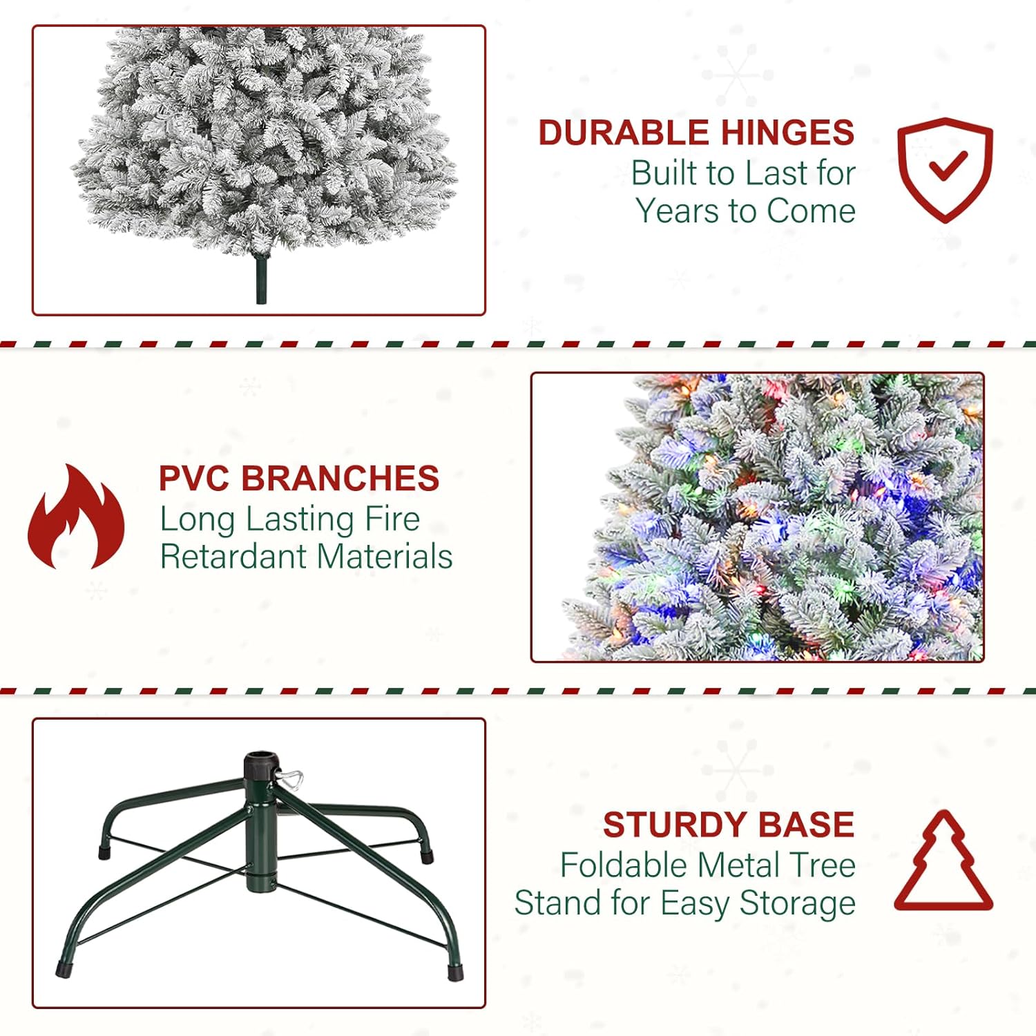 7.5ft Lighted Snow Flocked Christmas Tree, 450 Multicolor LED Lights, Artificial Christmas Tree with 1446 Branch Tips, Metal Stand & Hinged Branches for Decoration, 10 Modes
