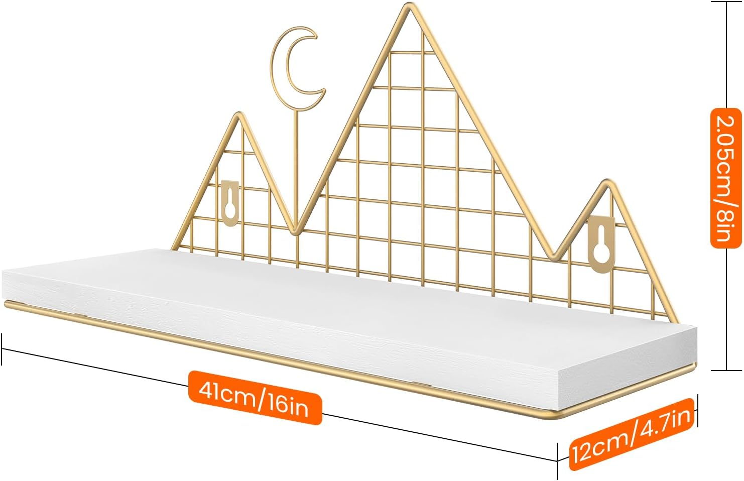Homode Floating Shelves, Set of 2 Mountain Shelves Wall Decor, Metal and Wood Hanging Shelves Woodland Bookshelf for Nursery, Kids Room, Bathroom, Bedroom, White and Gold