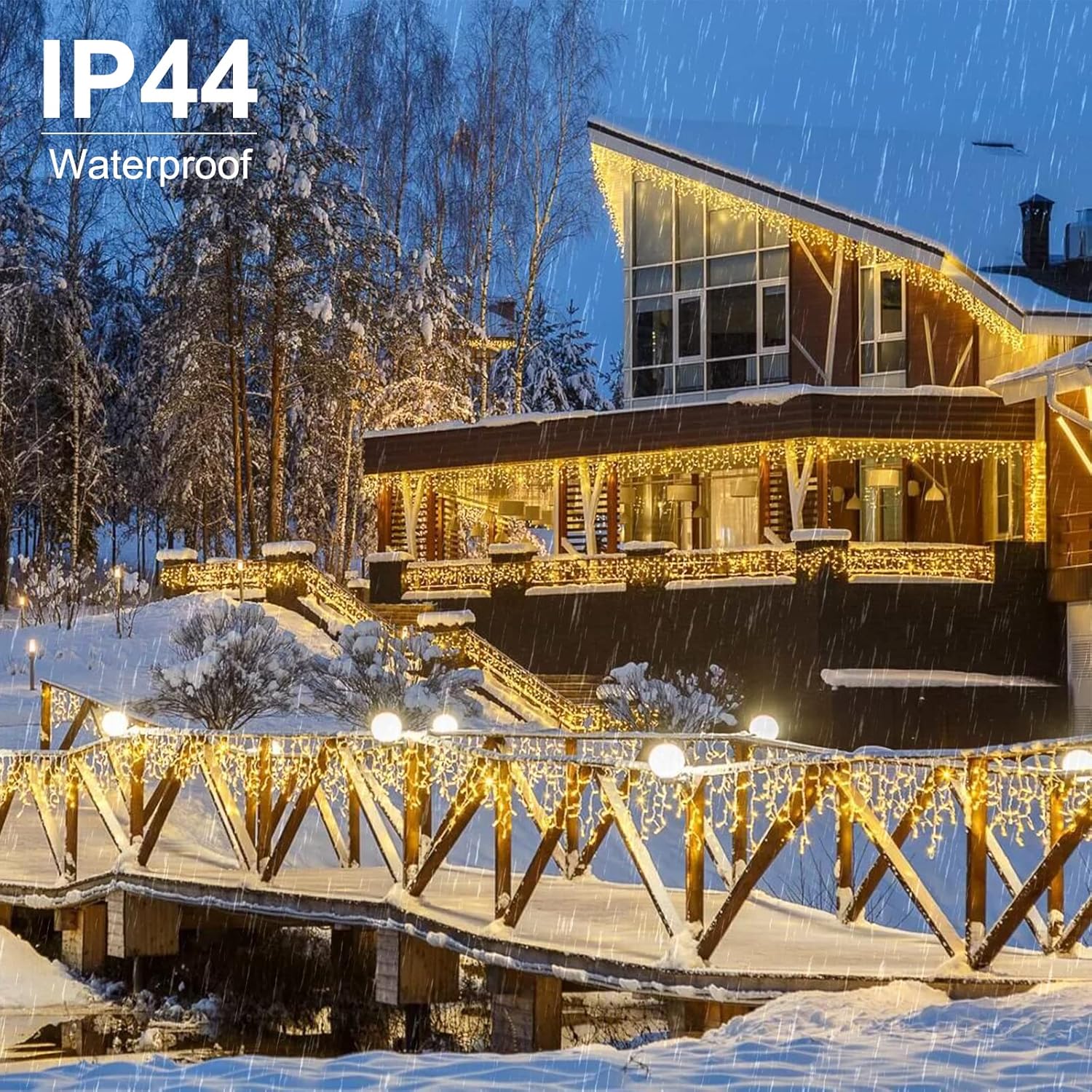 - Commercial Grade: The IP44 waterproof icicle fairy lights is great outdoor Christmas decorations for roof lines, porch fences, railings, window, bedroom, courtyard, balcony, gazebo, canopy, wedding, etc