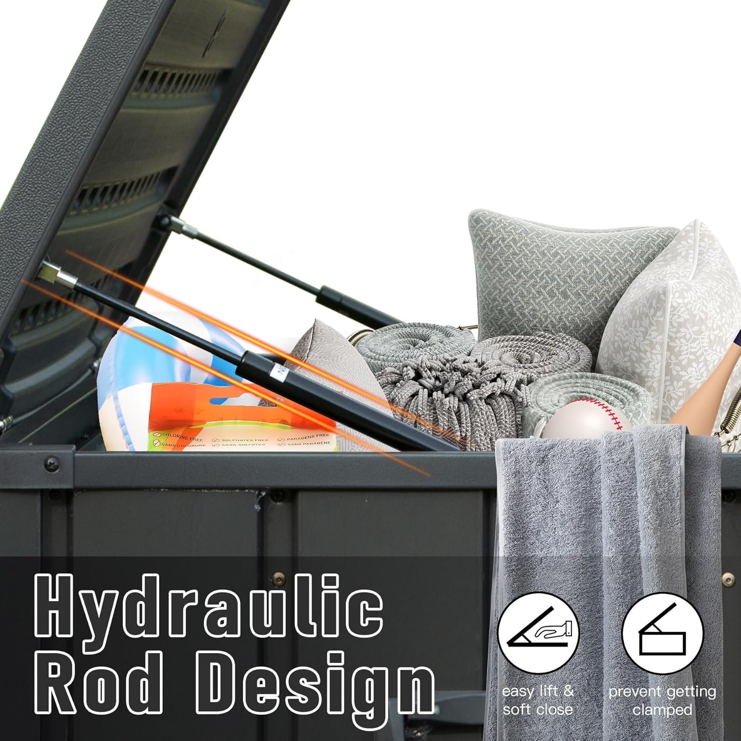 - 🌞【Humanized Hydraulic Pistons】: Easy lift and soft close mechanism allows the top completely open and shut smoothly with minimal effort-easy to use and no smashed fingers.