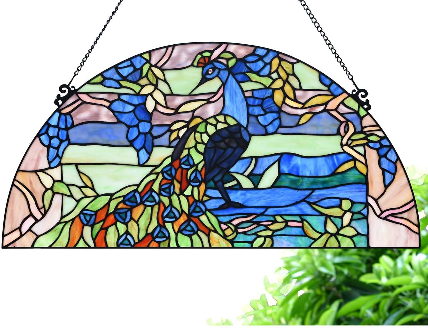 Bieye W10093 Peacock in Garden Tiffany Style Stained Glass Window Panel for Home Decor (Blue, 24Wx12H Half-Round)
