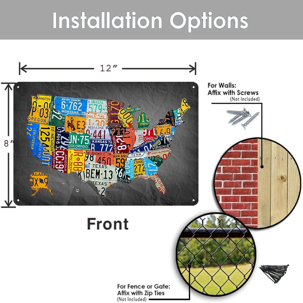 - Funny Metal Tin Sign Usage Scenarios: Vintage Metal Tin Sign Map Poster License Plate Map Of The United States Usa Signs Suitable For You To Hang Directly On The Wall Or Door Of Your Room, For Kitchen, Dining Room, Living Room, Bedroom, Bathroom, Office, Bar, Cafe, Club, Dorm, Man Cave, Garage, Garden, Street, Hallways, Road, Garag Wall Art Decoration. To Add More Charm To Your Life.