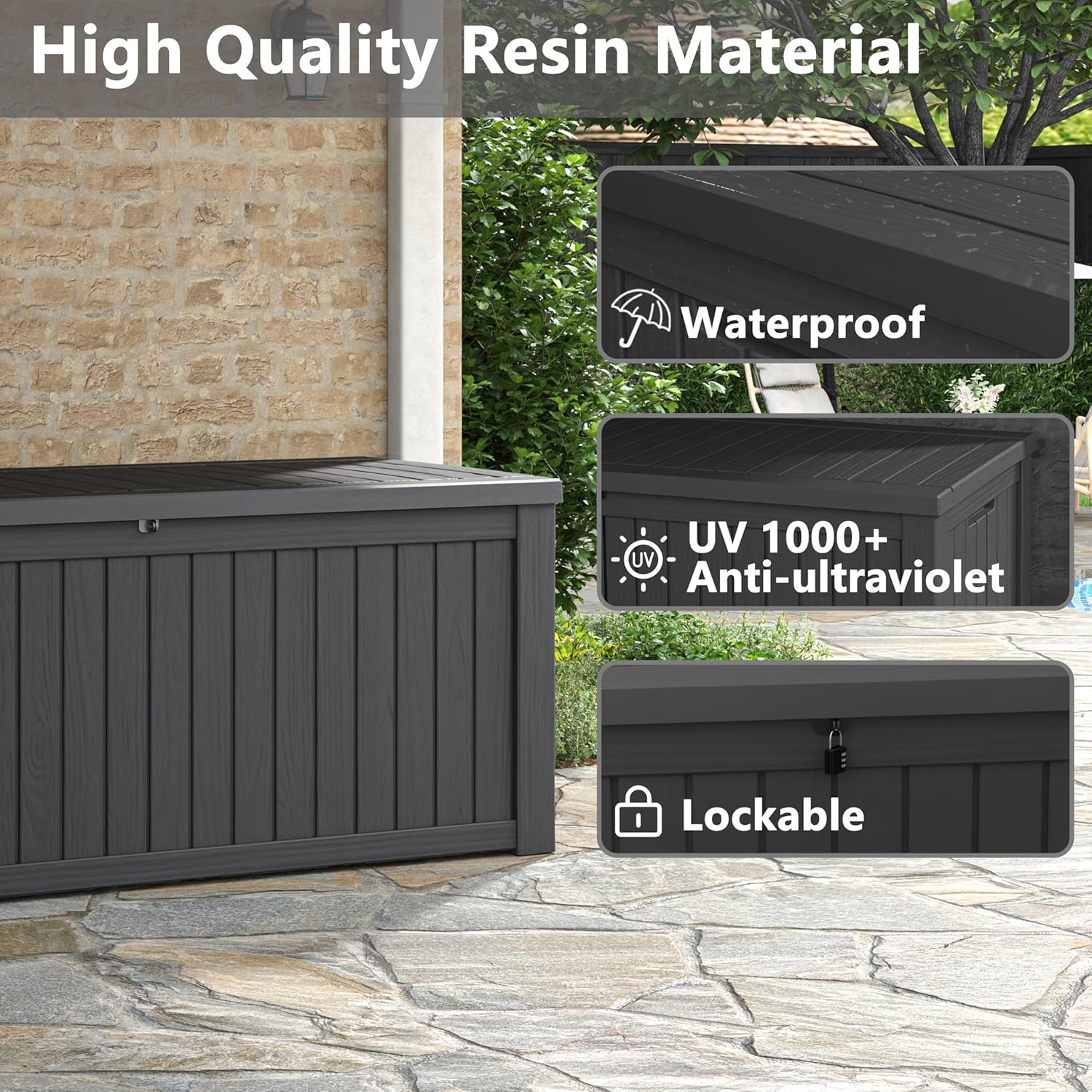 - ALL WEATHER RESISTANT - Weatherproof resin makes this outdoor storage box waterproof, rustproof, corrosion resistant and extremely low maintenance; its wood grain complements any décor; NOTE: The colour of the storage box may vary in different scenarios, with darker colours indoors and lighter colours outdoors; to avoid accidents, please remember to remove all stored items before moving the storage box!