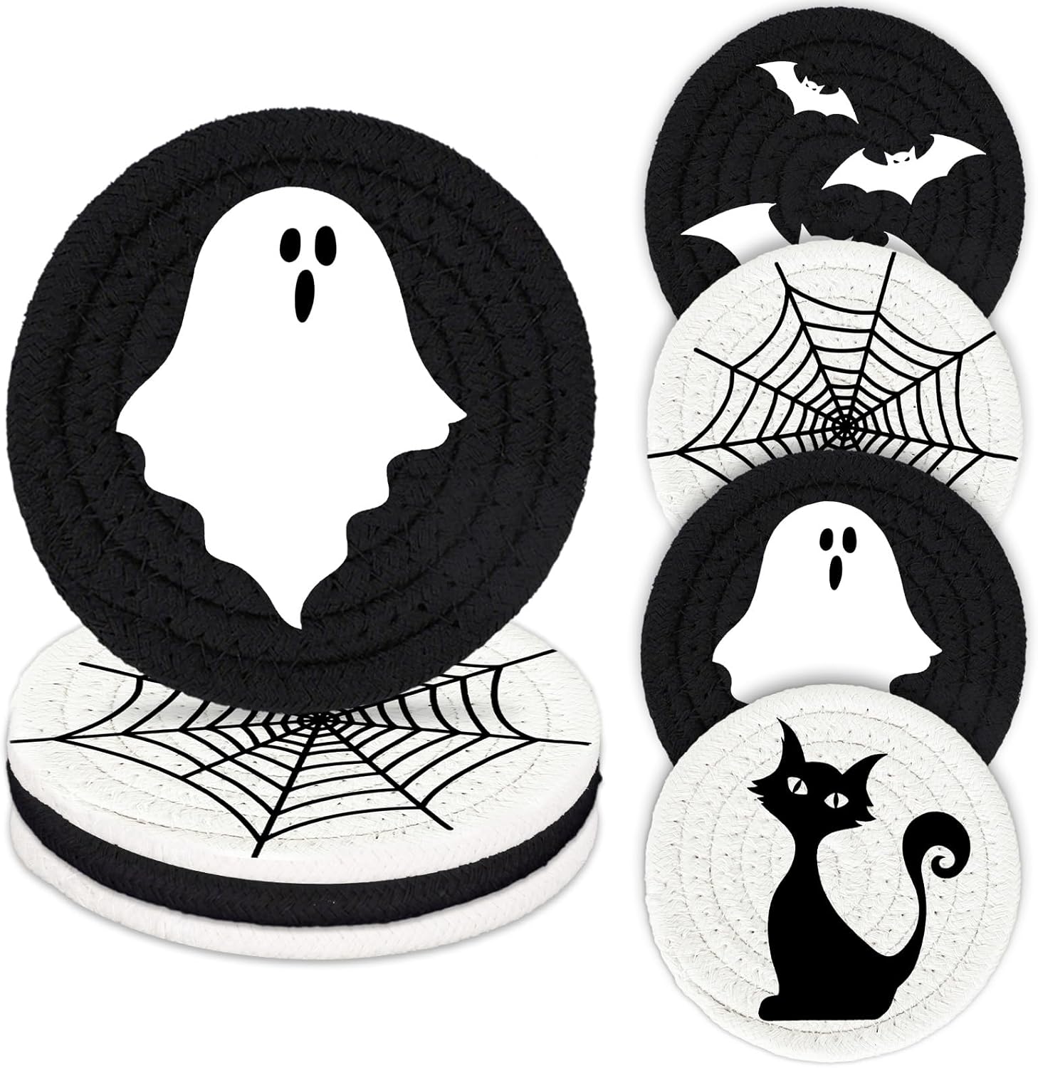 Whaline Halloween Handmade Braided Cotton Coasters Black White Ghost Bat Cat Spiderweb Drink Coasters Absorbent Cup Coasters for Halloween Party Home Office Decor, Set of 4