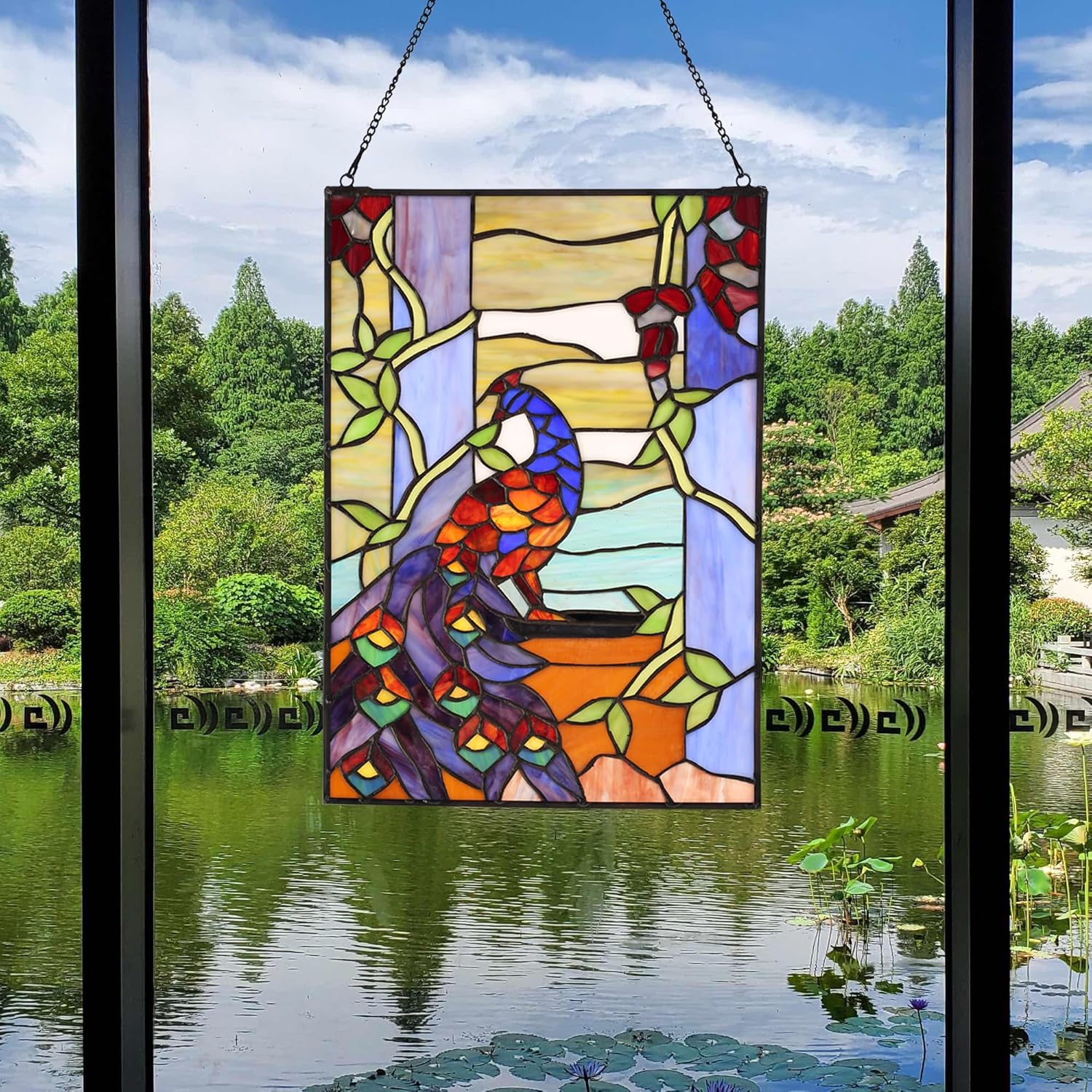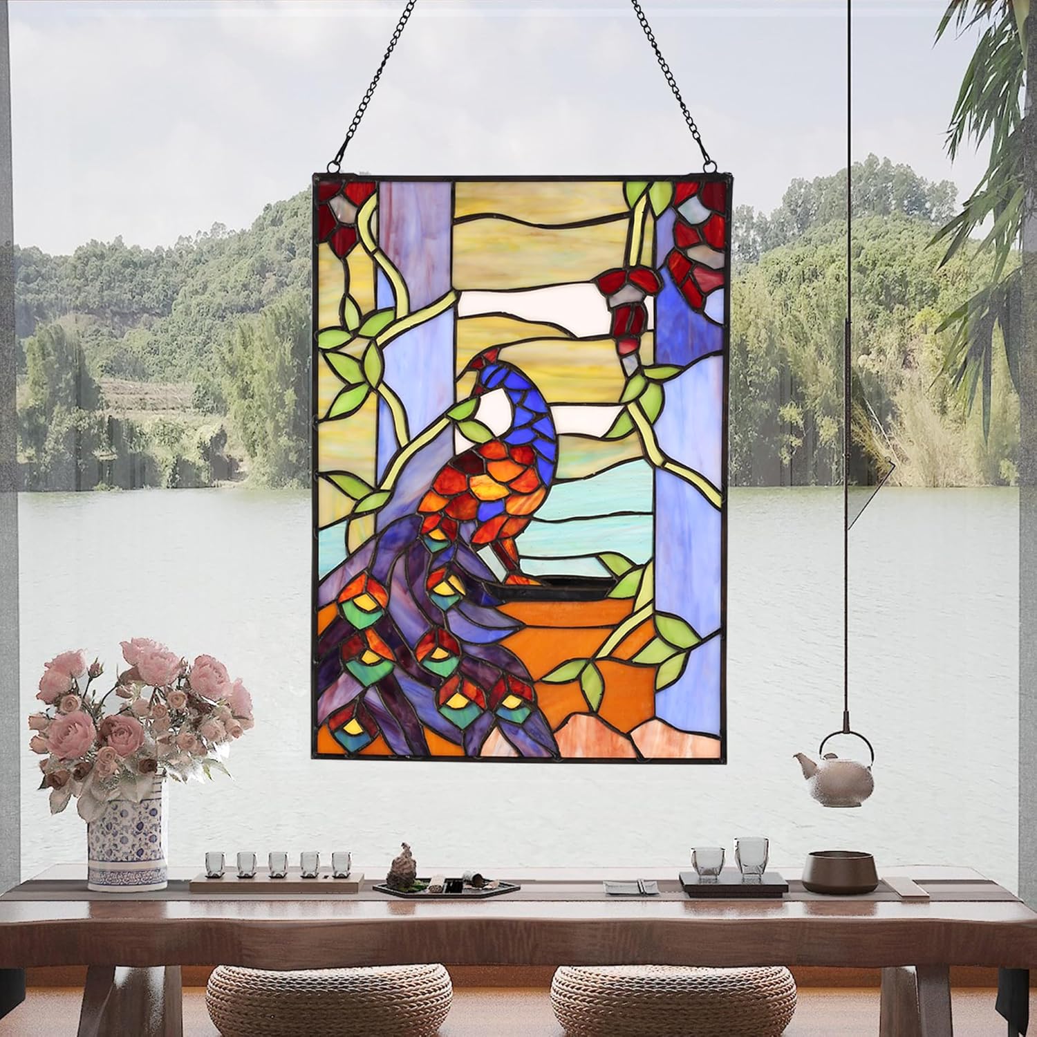 YOURANJU Stained Glass Window Hanging 16" H x 11" W Tiffany Style Rectangular Window Panel Suitable for Living Room Bedroom Kitchen Window Decoration Hangings with Chain (Peacock)