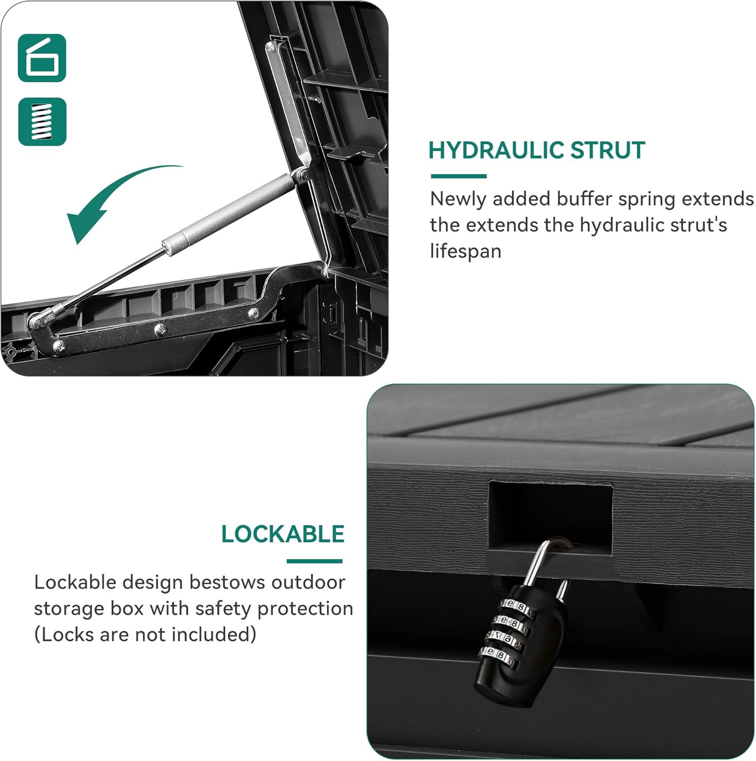- Thoughtful Design: Equipped with hydraulic rods, the outdoor storage box facilitate smooth lid operation. The lockable lid ensures that your belongings remain secure, whether you are storing valuable tools or other important items