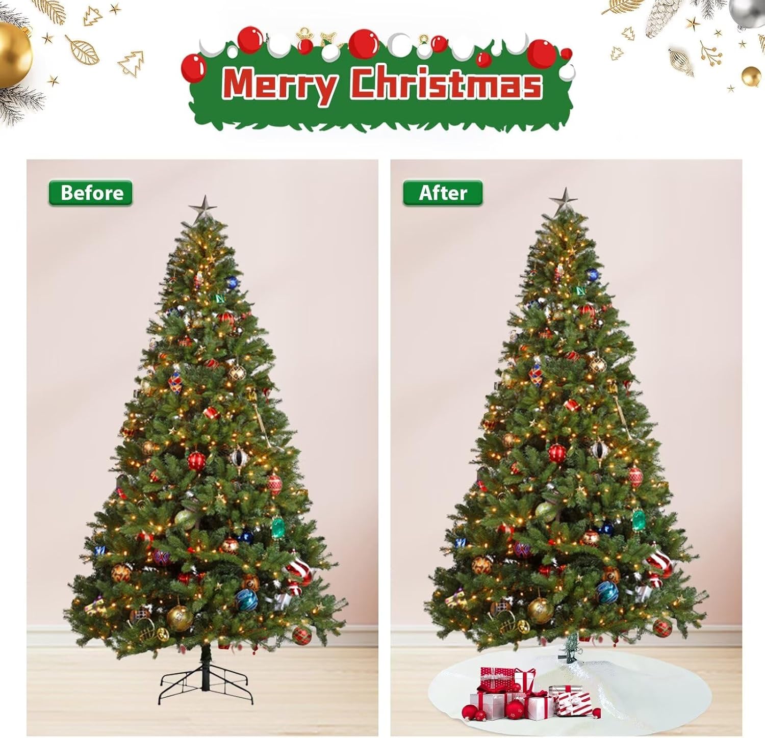 - 【Widely Application for Christmas】The round tree skirt great for indoor and outdoor tree decorations. Great for living room, office, theme party, classroom, supermarket, garden, bar, hotel, and any other scenes. Bring warm and comfortable atmosphere into your home