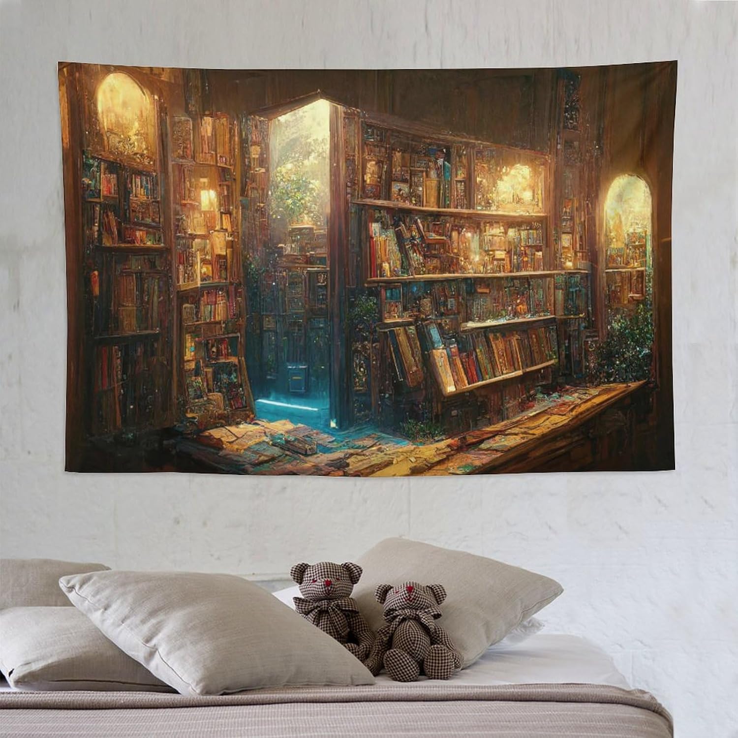 Kurtect Bookshelf Tapestry,Vintage Style Library Watercolor Art Theme Pattern Print Tapestries for Party Beach Picnic Blankets Tablecloths Living Room Wall Deocr, 60x90 in