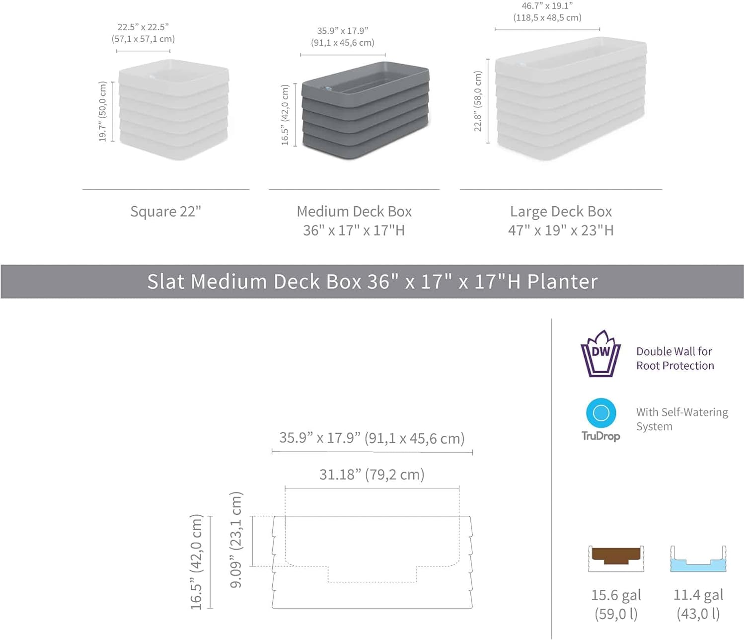 Crescent Garden TruDrop Self Watering Slat Medium Rectangular Planter Box for All-Weather - Outdoor Deck Box Planter for Flowers and Herbs, 36'' x 17'' x 17''H (Shadow)