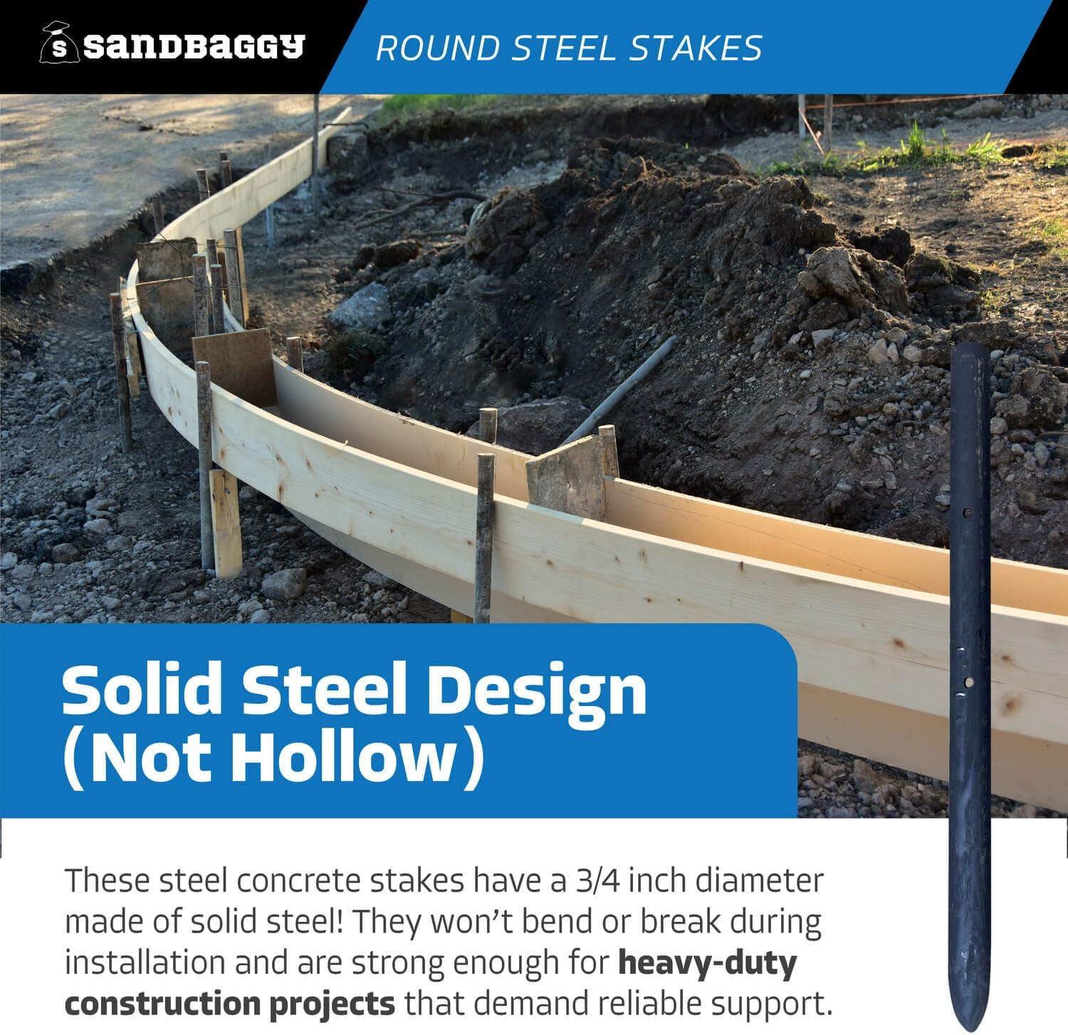 - SOLID STEEL DESIGN (NOT HOLLOW): These steel concrete stakes have a ¾ inch diameter made of solid steel! They won’t bend or break during installation and are strong enough for heavy-duty construction projects that demand reliable support.