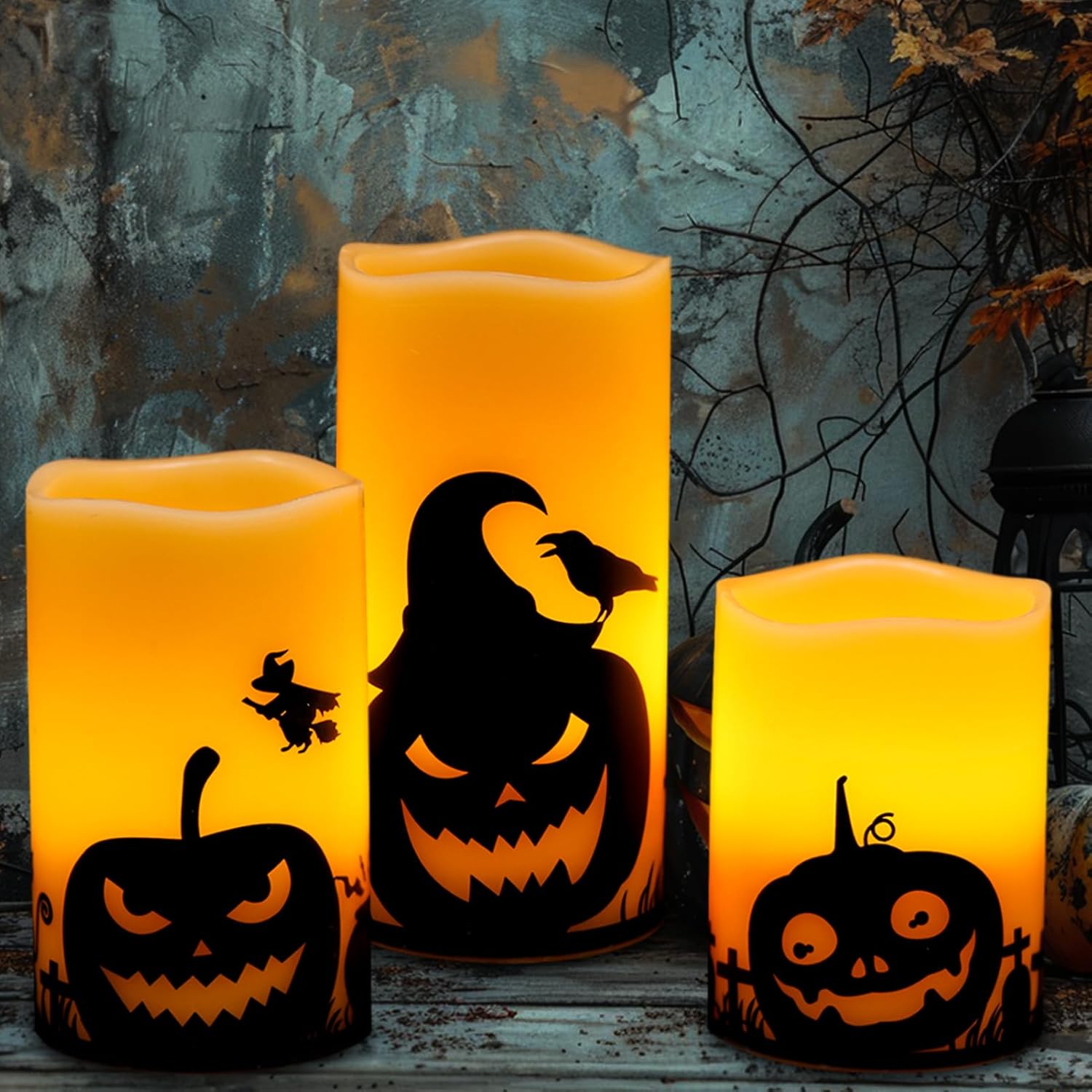 - Package Included: You will receive 3 x LED flameless candles with pumpkin decals (D3" x H 4"5"6"), 1 x user munual, each battery candle is powered by 3AAA batteries (included in the candles). These candles should be stored with batteries removed so as to avoid damaging the fixtures in the bottom of the candles