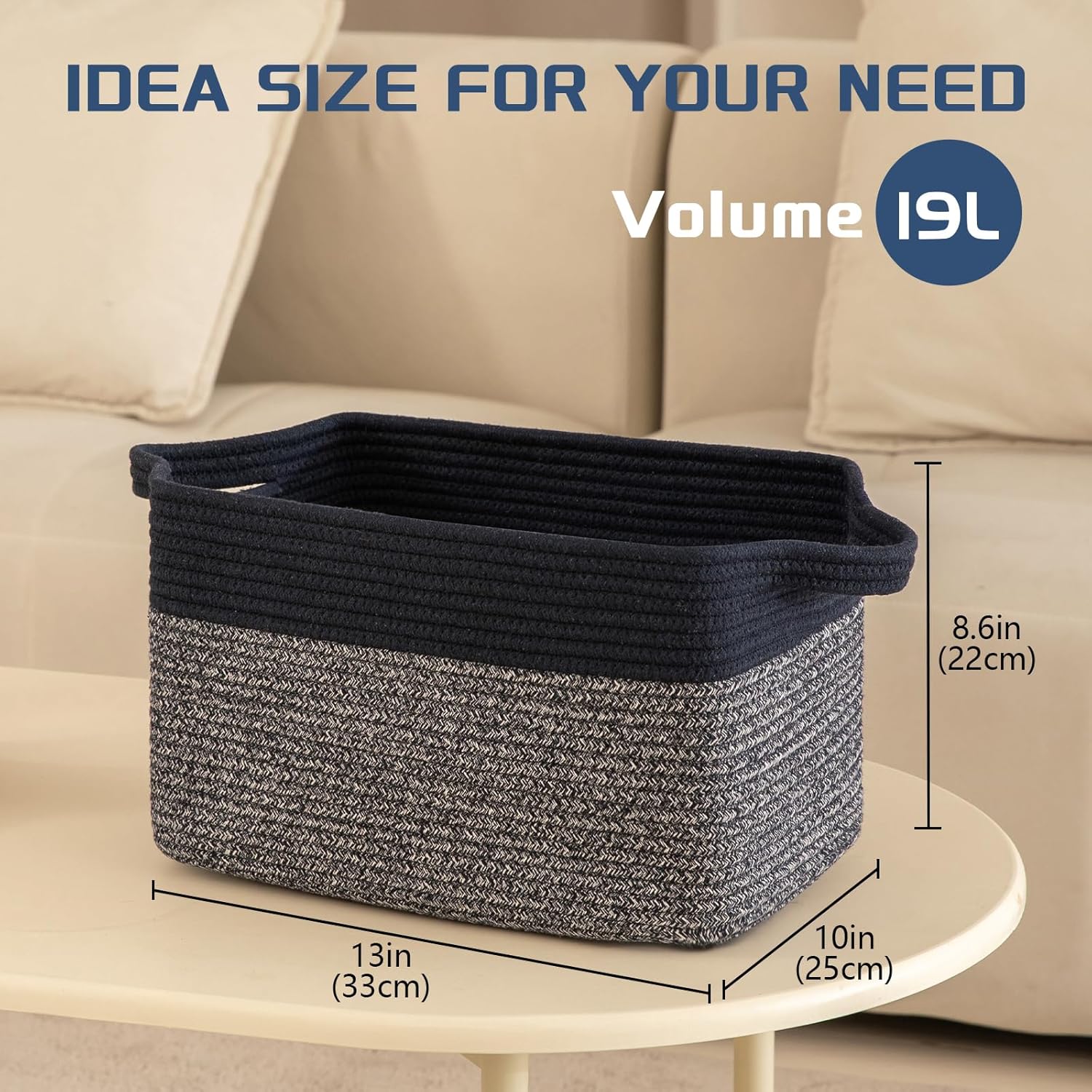 Storage Basket for Organizing, Woven Baskets for Storage, Rectangle Decorative Baskets for Shleves, Closet, Toys, Books, Nursery Organizer Bins - Pack of 3 (Blue & Black)