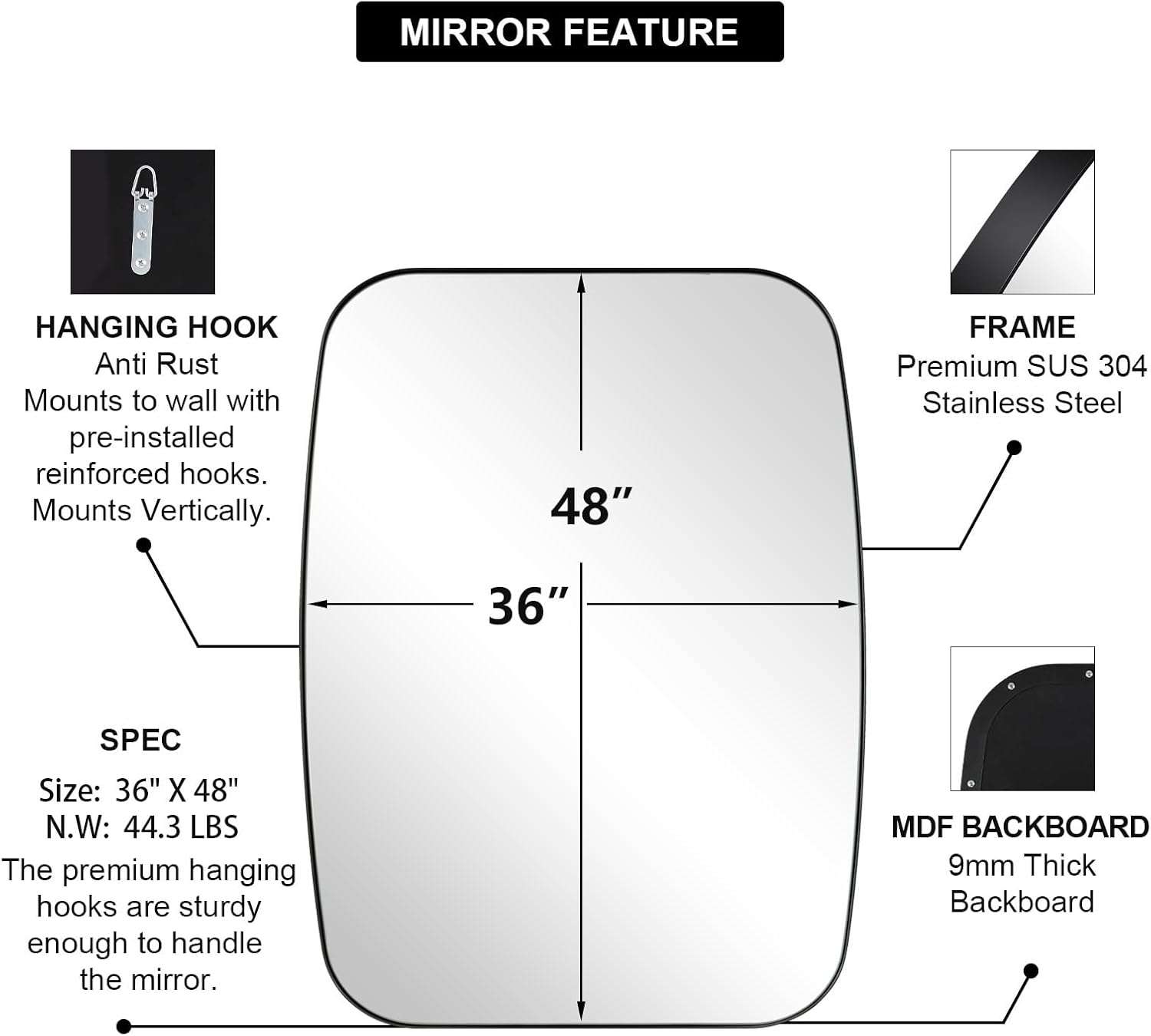 - Transform Spacious Environments: Redesign your spacious bathroom with the large 36x48 inch mirror. Its generous size and premium craftsmanship create a luxurious feel, reflecting light and space to amplify the room's aesthetic appeal and functionality