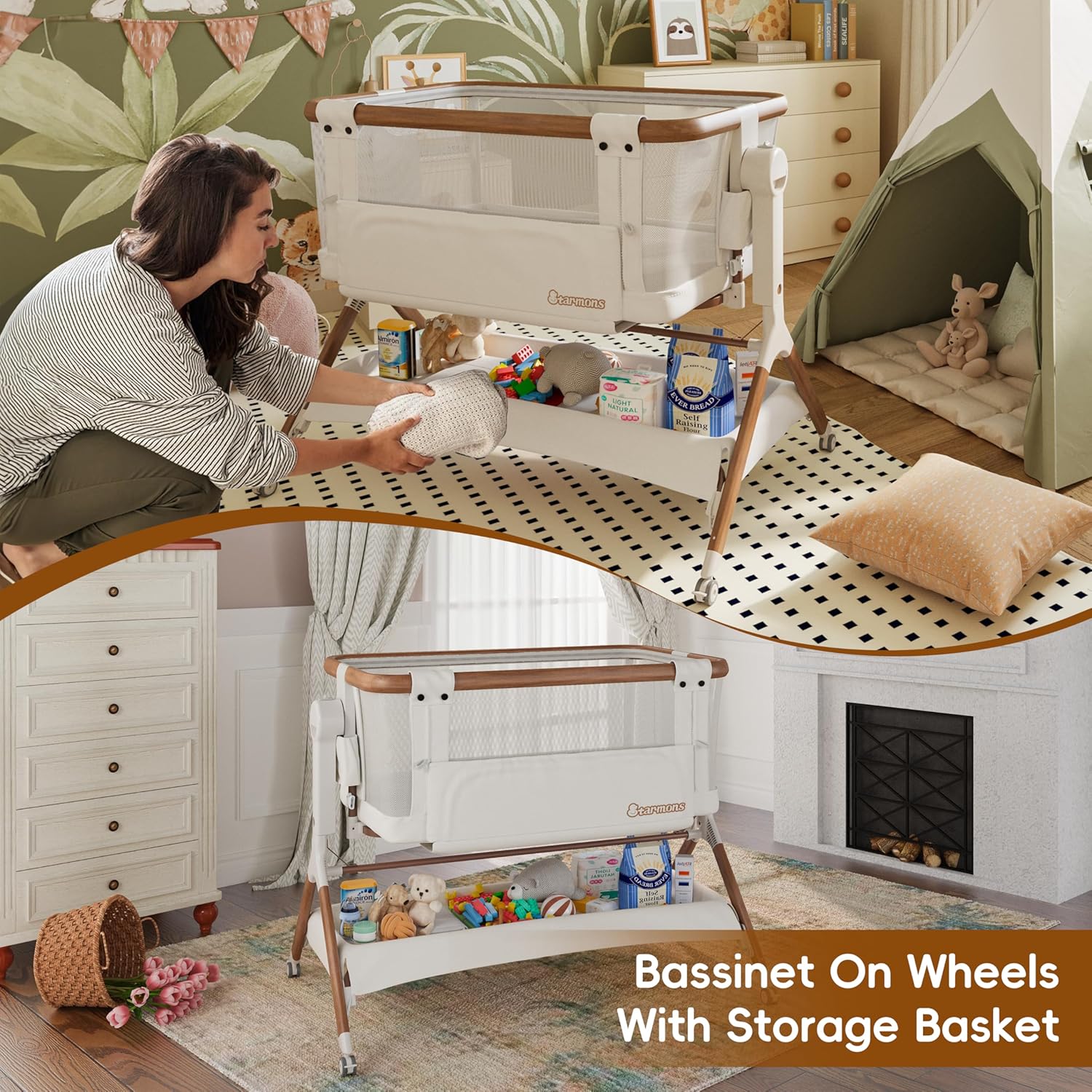 - COMES WITH A STORAGE BASKET:Featuring a convenient storage basket, Starmons bassinet is perfect for keeping diapers, toys, and blankets close at hand, ensuring you can easily find necessities.