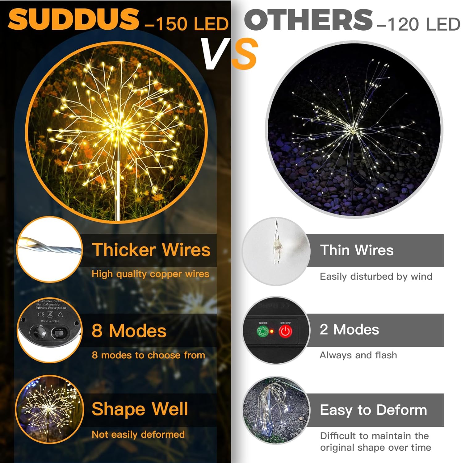 suddus Solar Garden Lights Outdoor Waterproof Decorative, 2Pack 150LED Firework Lights, Solar Fairy Lights for Yard, Garden, Party, Patio, Pathway, Flowerbed - Warm White