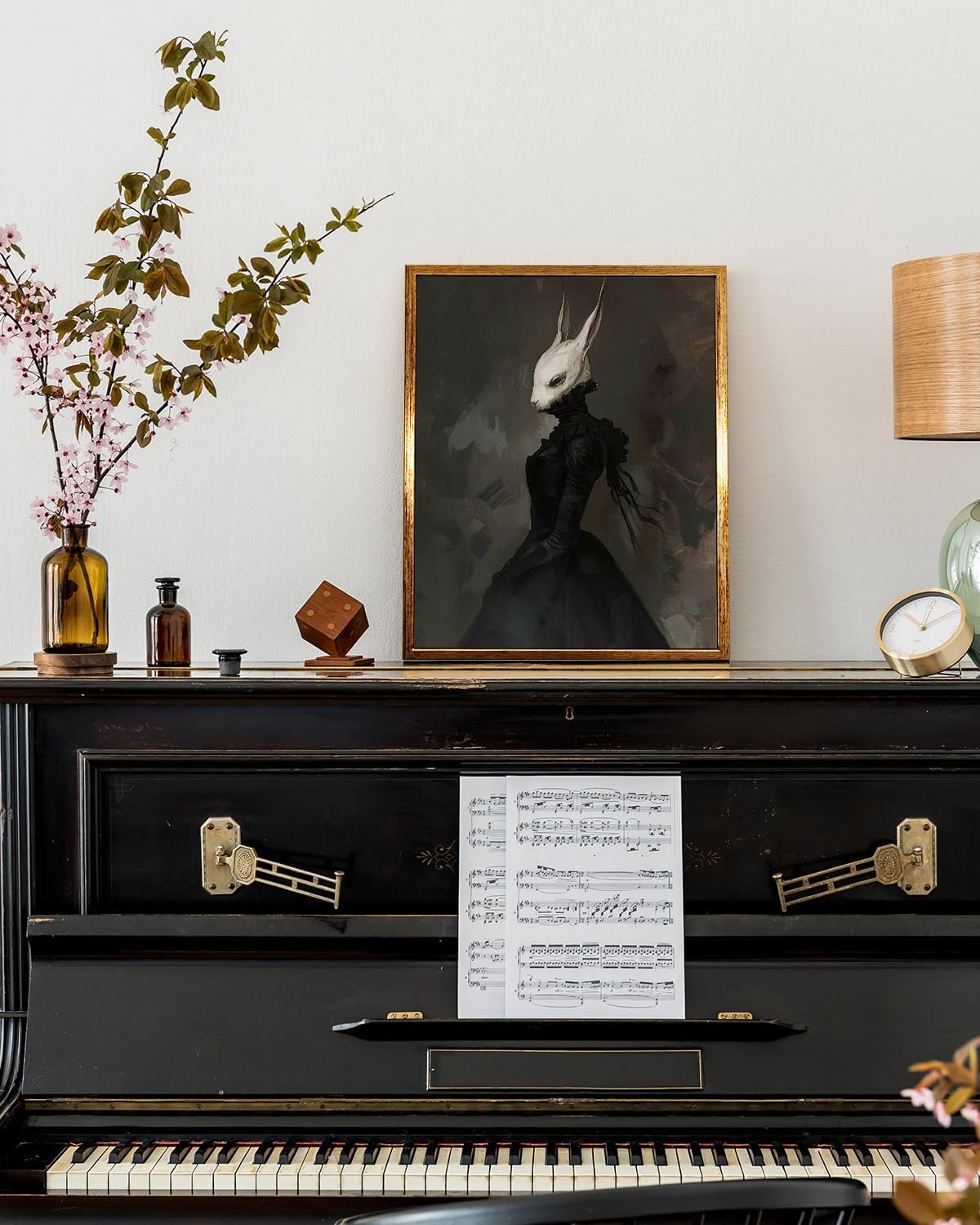 VIYYIEA Framed Canvas Wall Art Home Decor Gothic Room Decor Prints, Vintage Rabbit Lady Wall Decor, Aesthetic Dark Academia Halloween Wall Pictures Gold Framed Goth Artwork 9x11in