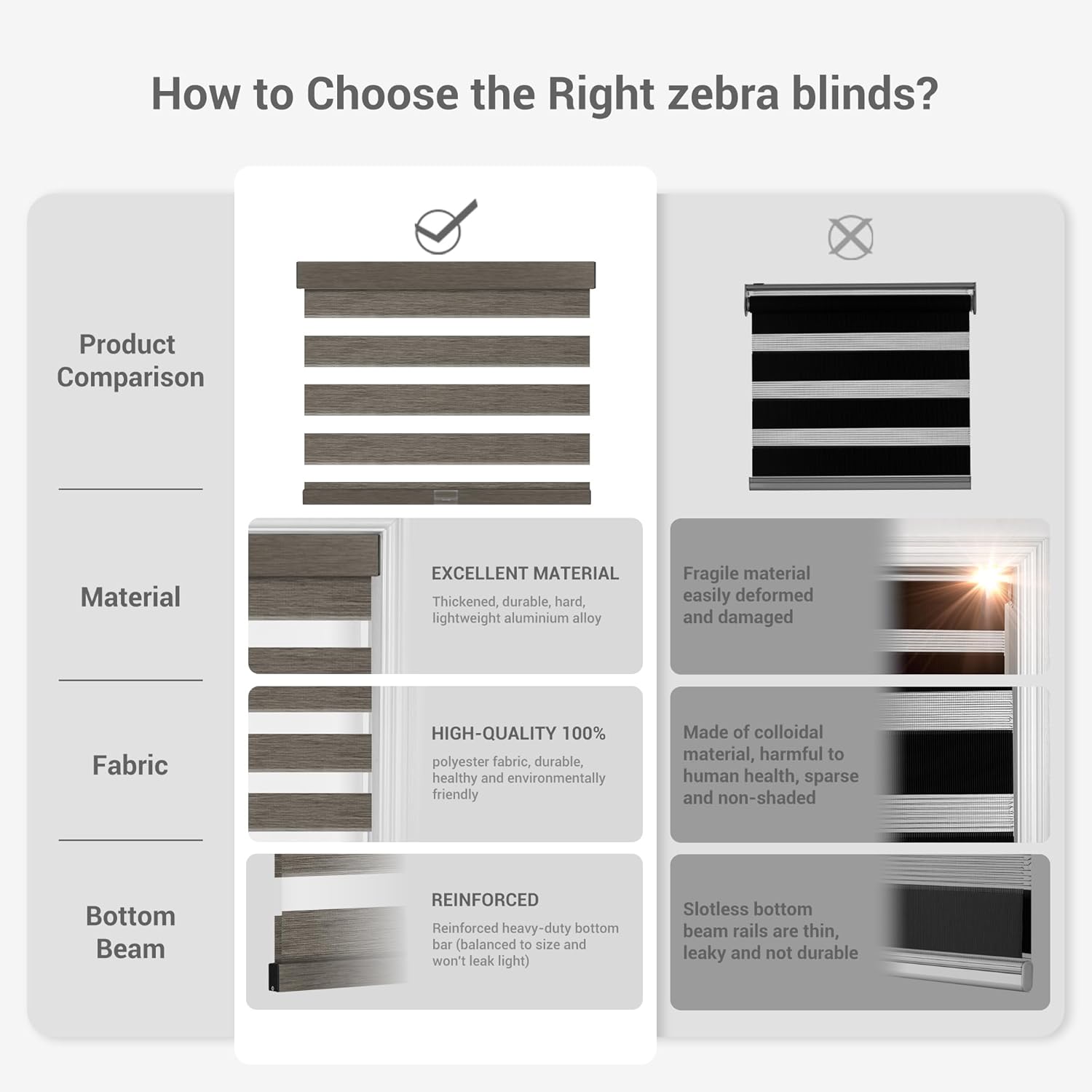 - 【Upgrade High-Quality Accessories】Our blind has been upgraded to have a sturdier bottom rail to prevent the fabric from fraying, which makes the two layers of fabrics more closely fit, maximizing the effect of shading. An anti-collision strip installed under the rail for protecting your window frame. Color-matched valance and the aluminum bottom bar suitable for all situations.
