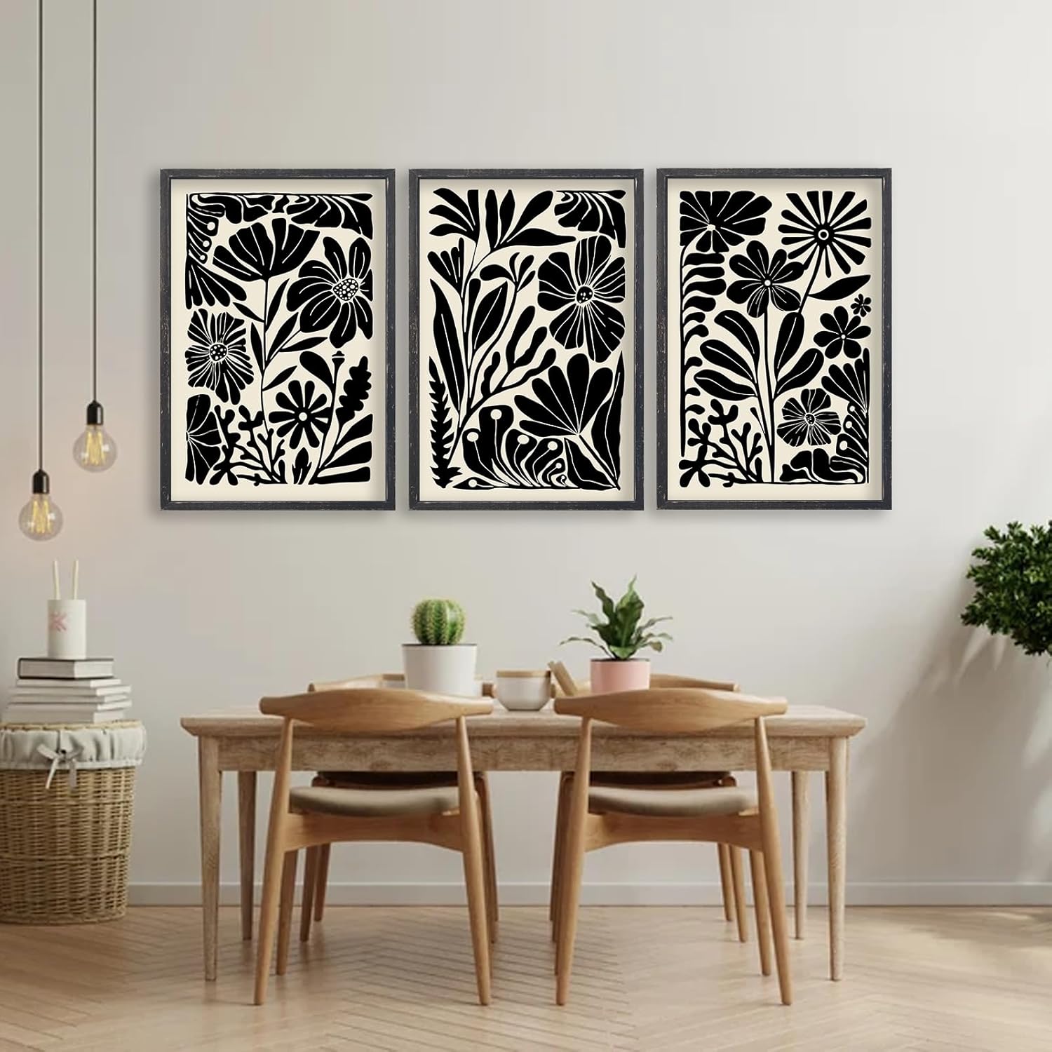 Abstract Floral Botanical Wall Art 16x11 Inch 3 Piece Black Vintage Boho Plant Flower Minimalist Wood Frame Sign Home Living Room Family Office Mid Century Print Wall Hanging Decor (Black)