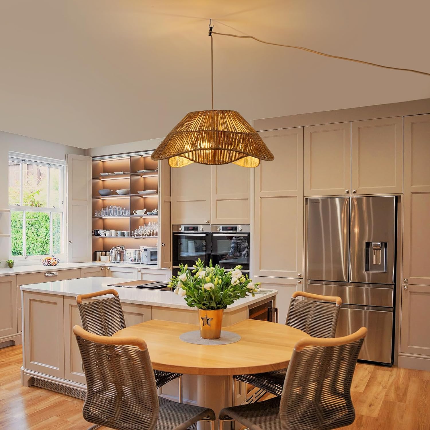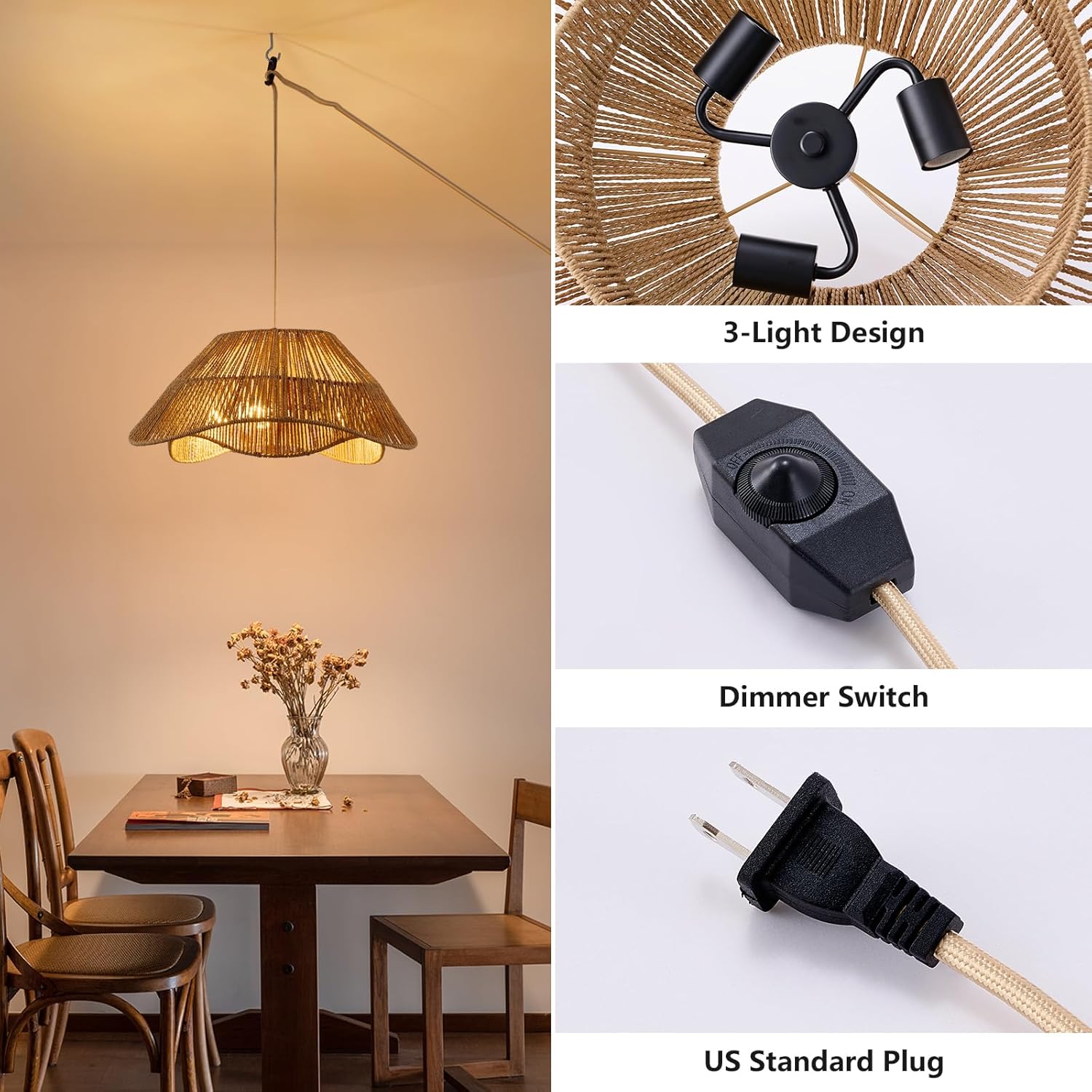 - 【Unique Design】Crafted from hand-woven natural rattan and durable metal, the plug-in pendant light blends farmhouse and boho styles to complement your indoor and outdoor decor. The double irregular rattan design diffuses light evenly and casting petal-like shadows on the ceiling, creating a warm and inviting ambiance.