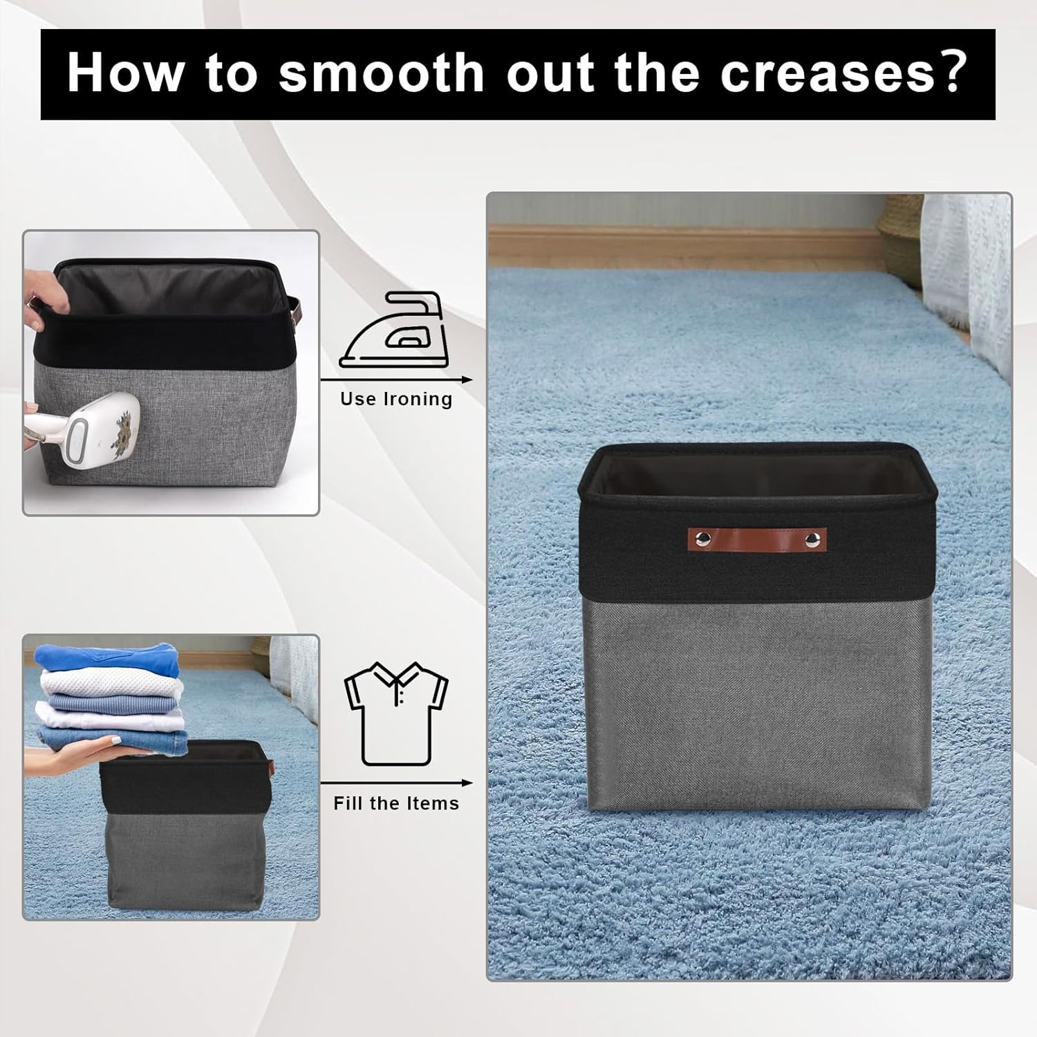 - 【Maintenance & Care Tip】 - Collapsible design for space saving. Our foldable baskets comes in a compression packing which may result in wrinkled storage bin during the long transit. Get rid of the wrinkles by either stuffing the fabric storage bins with blankets and pillows for a few days or steam iron them at low-heat setting. The organization baskets are easy to clean, you can dust the basket with a soft cloth with light soapy water when needed. Not recommended to machine wash.