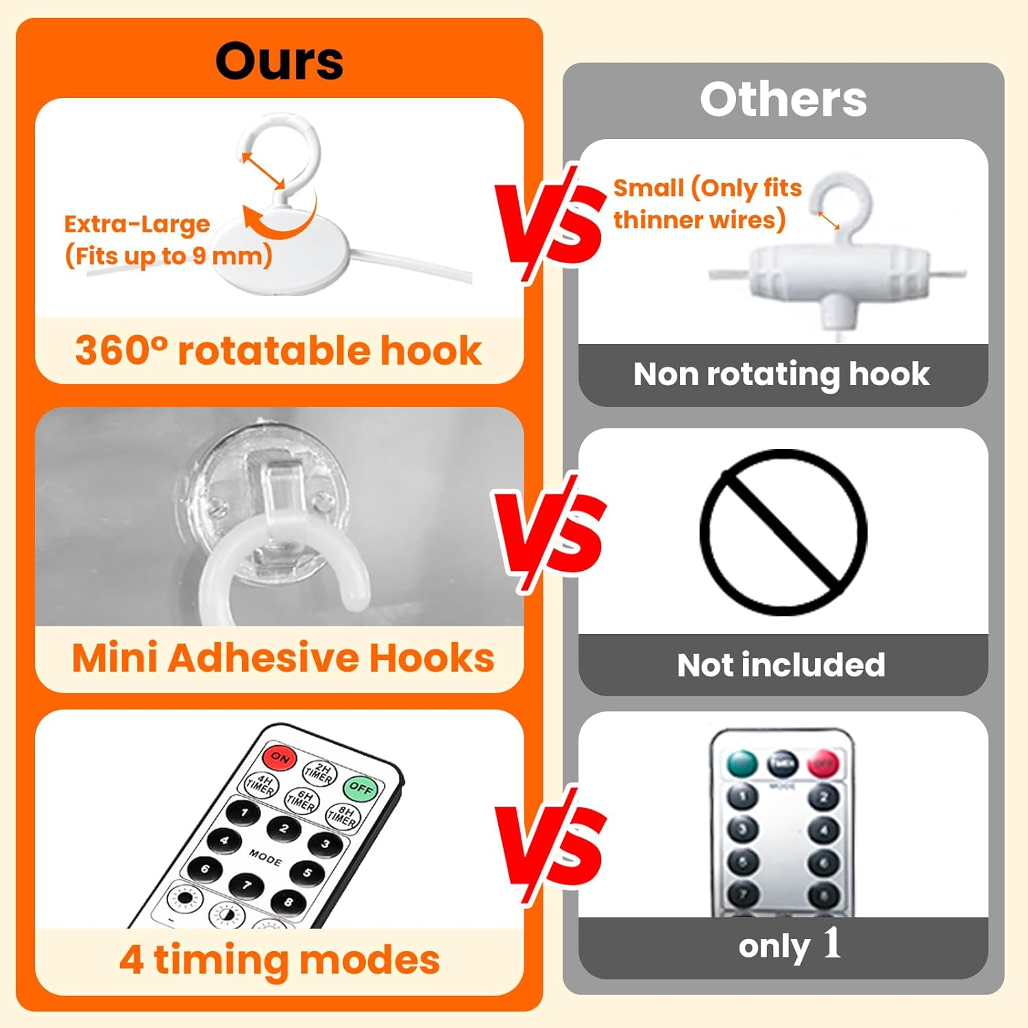 - 8 Light Settings & Timer Remote: Unlike others, our 17-Keys remote added 4 timing modes (2/4/6/8 hours on, 22/20/18/16 hours off). 8 different flash modes to choose from, and you can adjust the brightness of the lights by pressing "dim" ,“+” and "-". That are all controlled easily by a wireless remote at 10~15 meters, aim at the USB receiving direction when you press. All is in your control