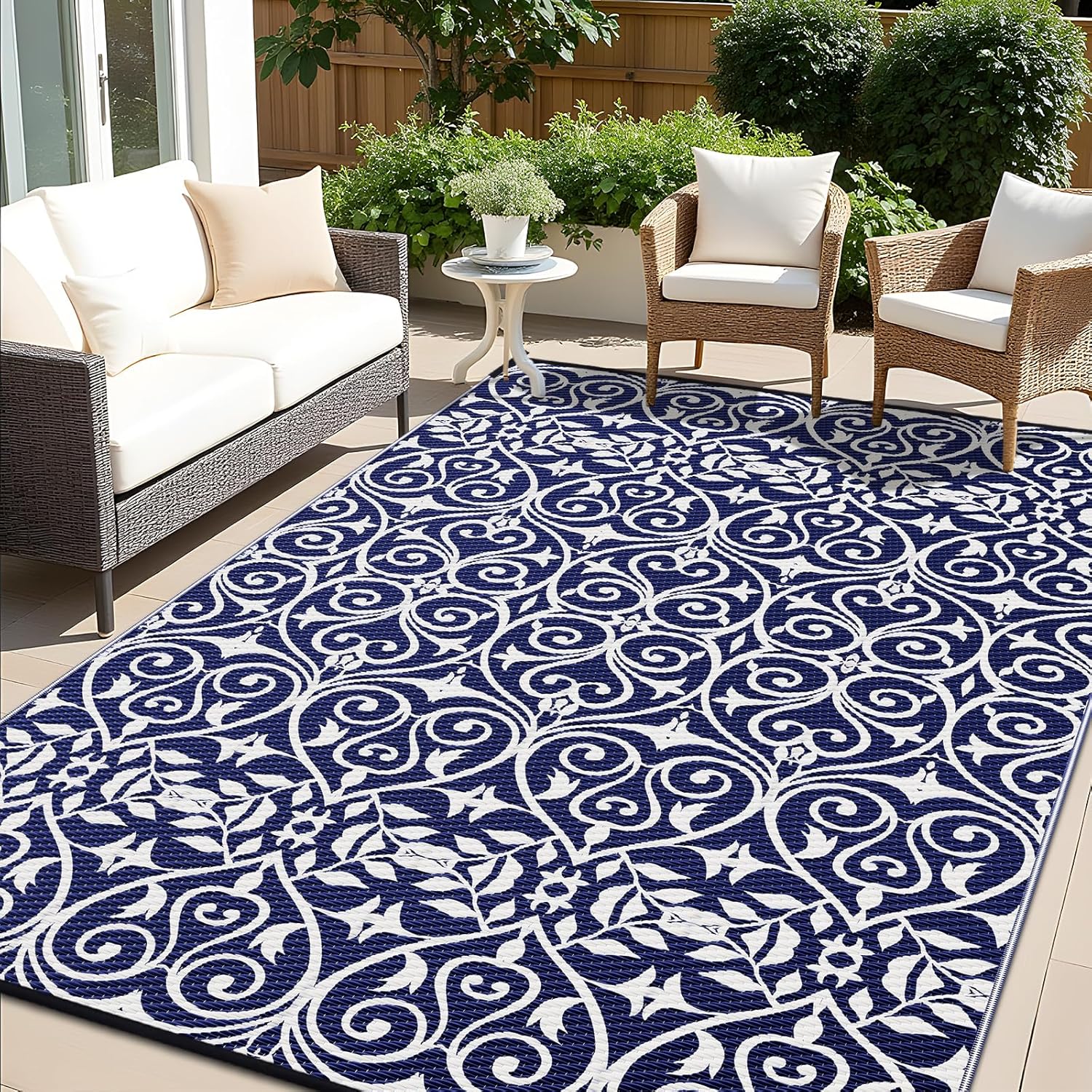 OLANLY Outdoor Rug Waterproof 6x9 ft Clearance, Reversible Outdoor Plastic Straw Rug with Floral Pattern, RV Mat for Patio, Camping, Balcony, Deck, Backyard, Navy & White