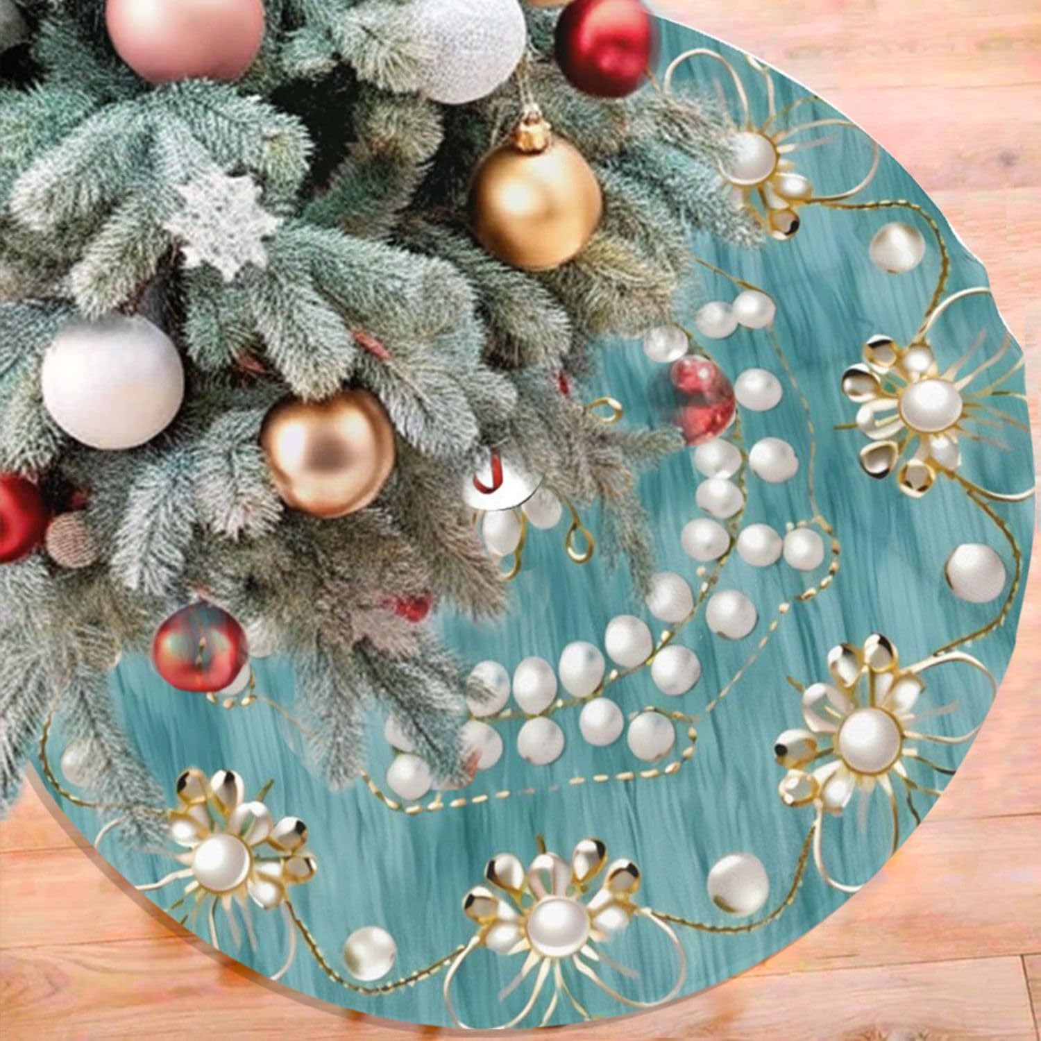 48" Large Christmas Tree Skirt, Elegant Circular Round Shape Turquoise Pattern Tree Mat Base Cover for Xmas Festive Holiday Party Decoration Ornaments