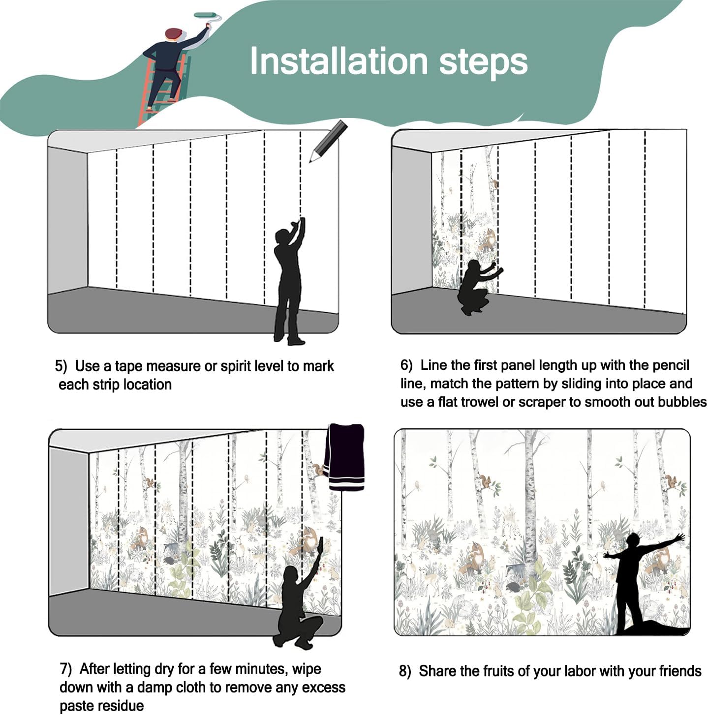 - Mural wallpaper size: 100 "W x 65 "H, divided into 5 sections, each section is labeled with a number underneath, there is no need to overlap the pattern when installing, just install according to the number labeled underneath the panel