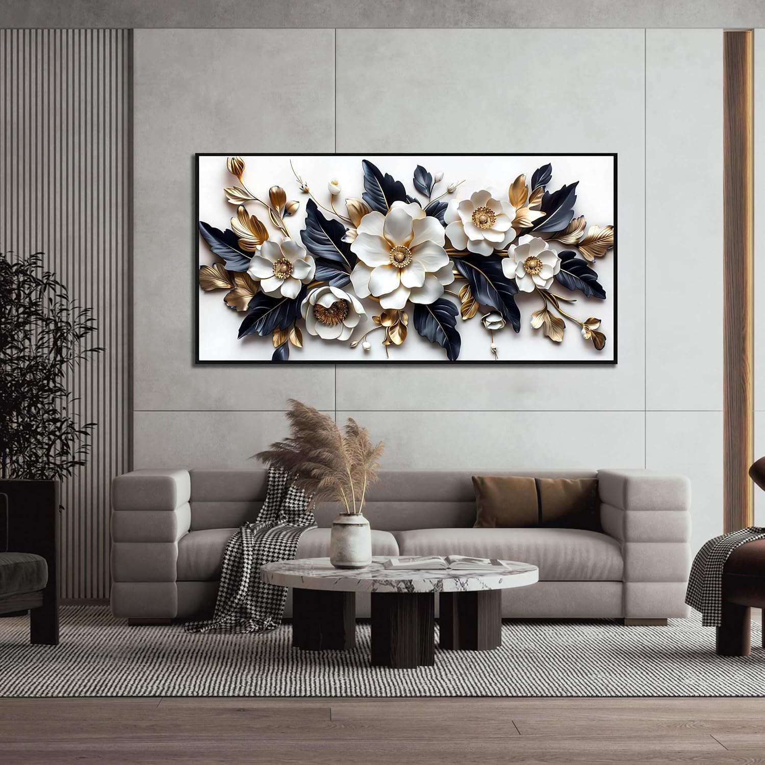 White Flowers Wall Art for Bedroom - White and Gold Wall Art for Office - Framed Wall Art for Living Room Large Size 29" x 59"