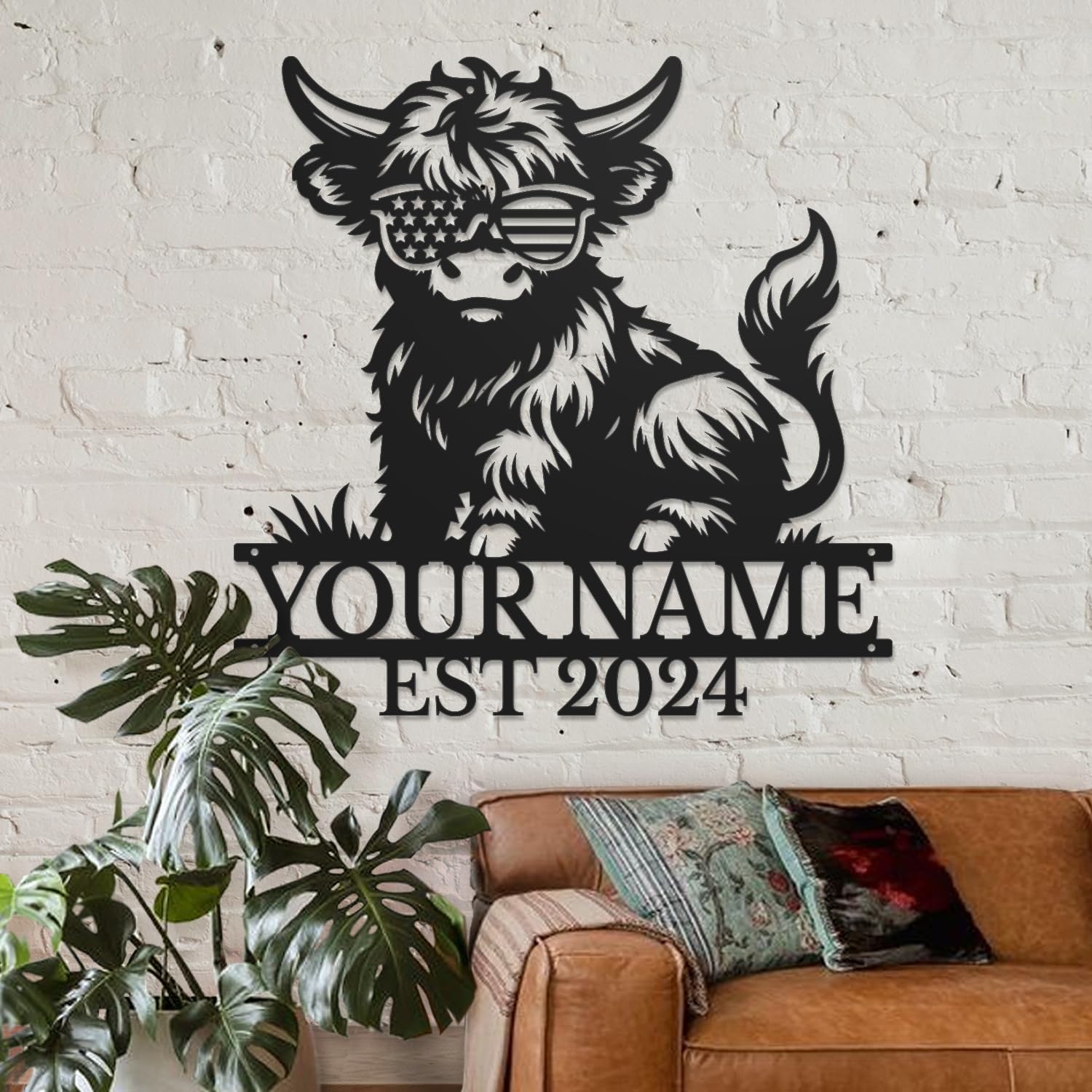 Personalized Highland Cow Name metal Signs,Custom Highland Cow Metal Shed Wall Decor,Black Metal Wall Art Plaques Outdoor wall Decorative Signage (Style C)