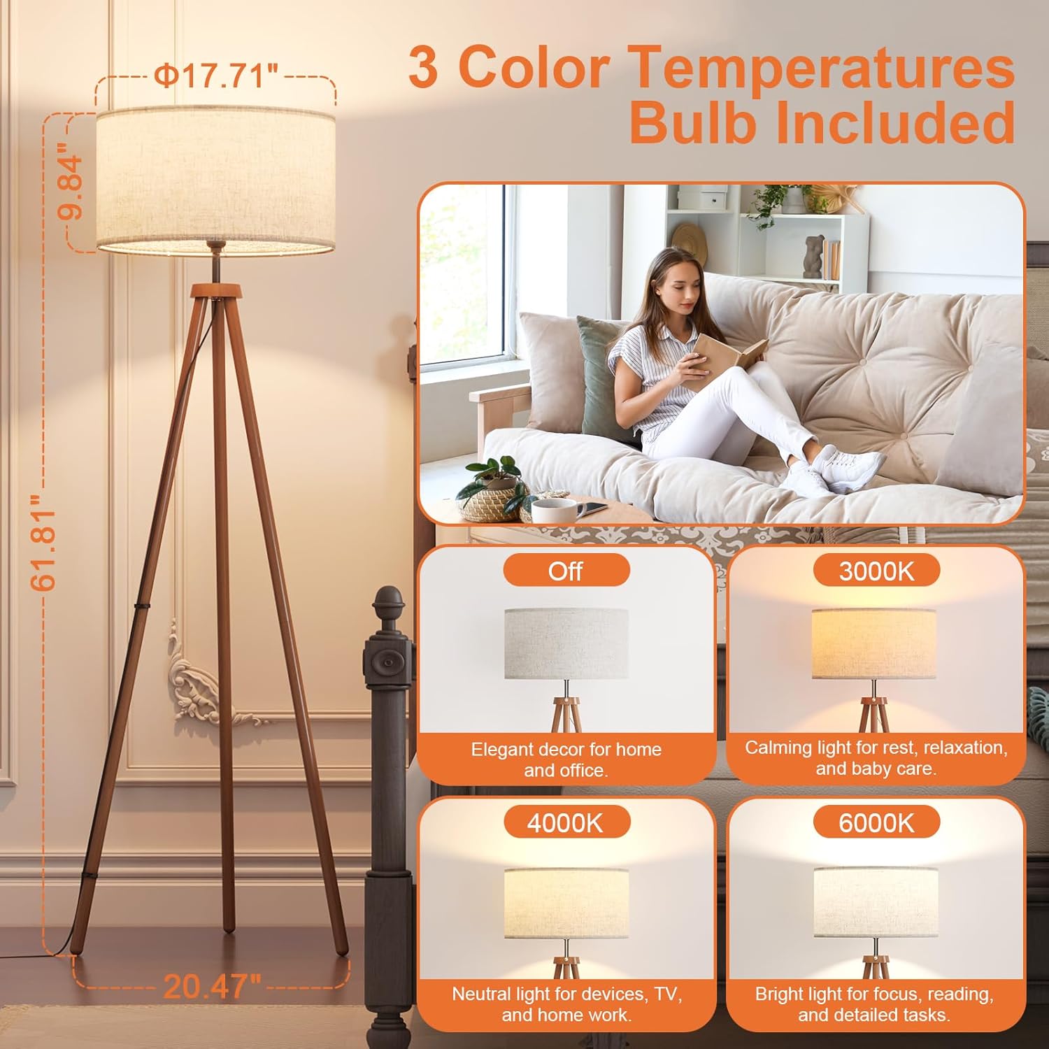 LiteHistory Wood Tripod Floor Lamps for Living Room, Bedroom, and Office,Standing lamp with Beige Linen Shade, 12W Three-Color Bulb Included, Pull Chain Switch, Tall lamp for Mothers Day Gifts, Brown