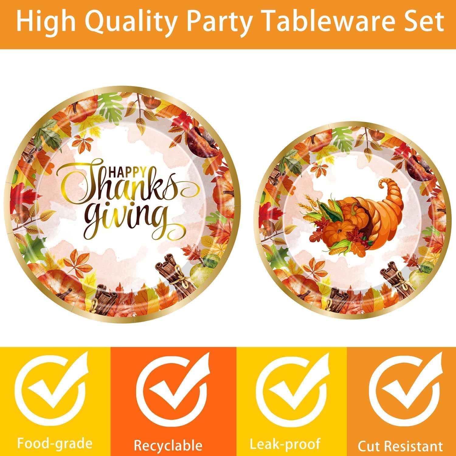 - THANKSGIVING PARTY DECORATIONS: Super value set, 96Pcs in total. Each Thanksgiving party plates and napkins set contains 24Pcs 9''thankgiving plates, 24Pcs 7'' dessert plates, 24pcs 6.5'' fall napkins, 24pcs forks which serves for 24 guests.