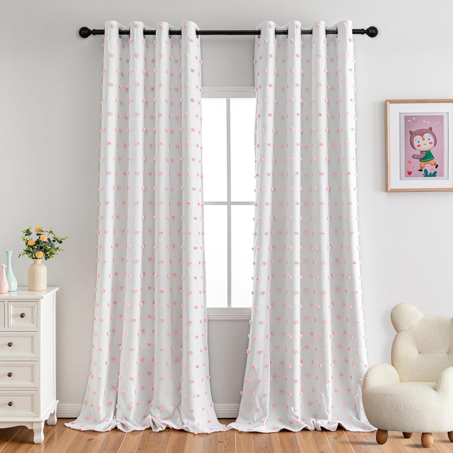 MYSKY HOME 100% Blackout Curtains for Living Room White Curtains 102 Inch Extra Long Total Light Block Girls Room Drapes Thermal Insulated Room Darkening Pink Pom Pom Sheer Grommet 2 Pieces 52 Wide