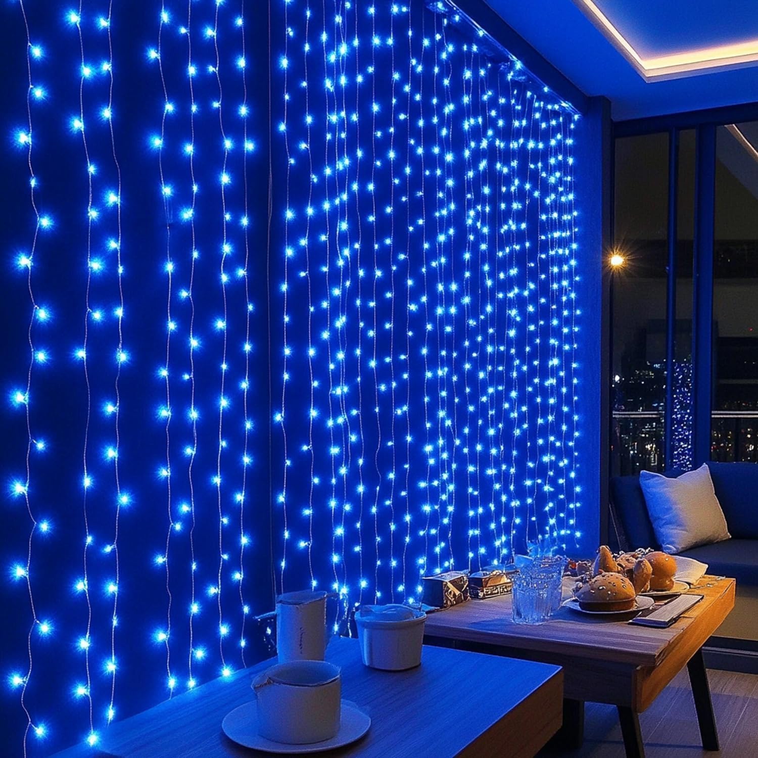 - Enchanting Blue Glow: Transform your space with a warm, inviting glow using these 300 LED curtain string lights. Measuring 9.8ft in width and 9.8ft in length, include a 9.8ft leading wire for flexible use.