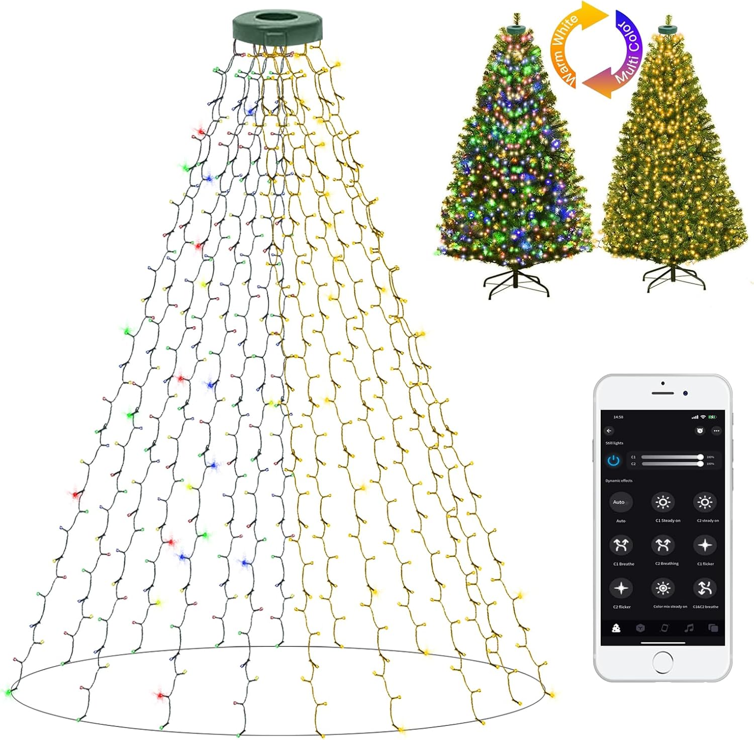 - 17 Modes Easy Halo Christmas Tree Lights with APP Control: Intensive 400 LEDs 6.56Ft x 16 Drops Warm White & Multicolor changing lights add a nice atmosphere to your Christmas.Hang this twinkle lights for Christmas tree (fit 6ft - 7ft trees) with a 16.4ft long enough lead wire plug.