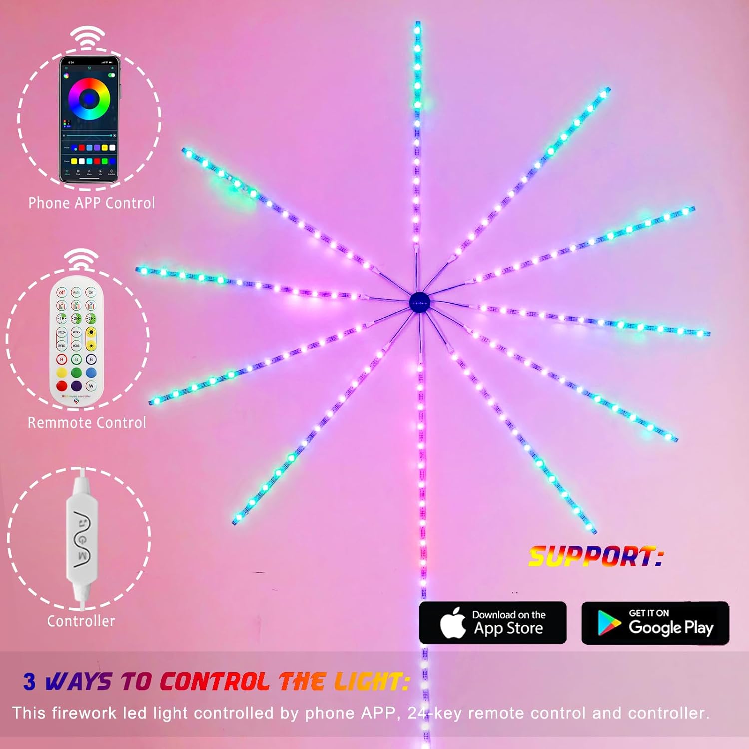 - 🎇Multi-Function Smart Fireworks Lights: Upgraded firework led lights has 16 million colors, 213 dynamic color changing effects, music sync, timer, DIY the color and brightness adjustable etc functions. This LED strip lights can create firework launch effect for decoration.
