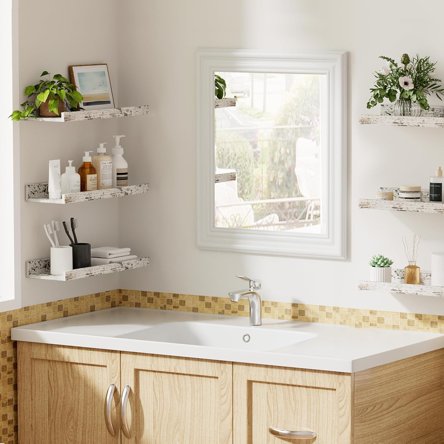 upsimples Floating Shelves for Wall, Wall Shelves for Decor Storage Set of 6, Wall Mounted Wood Shelf for Bedroom, Living Room, Bathroom, Kitchen, Picture Ledge Shelf, Rustic White