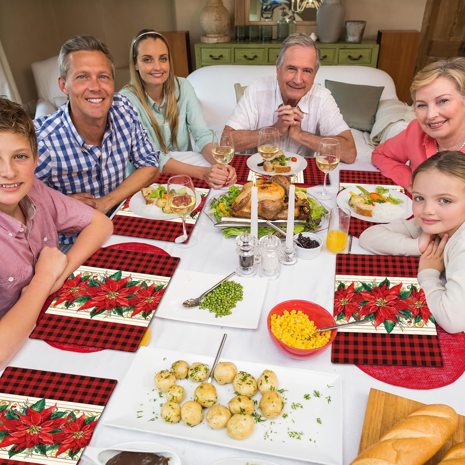 - Eye-Catching Design: Elevate your dining experience with our Christmas table decoration supplies. The Christmas poinsettia table mats feature bright colors and a classic Christmas design with red and black plaid and an elegant poinsettia pattern. These Xmas dining mats add a touch of brilliance to your Christmas dinner table. Impress your guests and create an unforgettable cheerful atmosphere for your party.