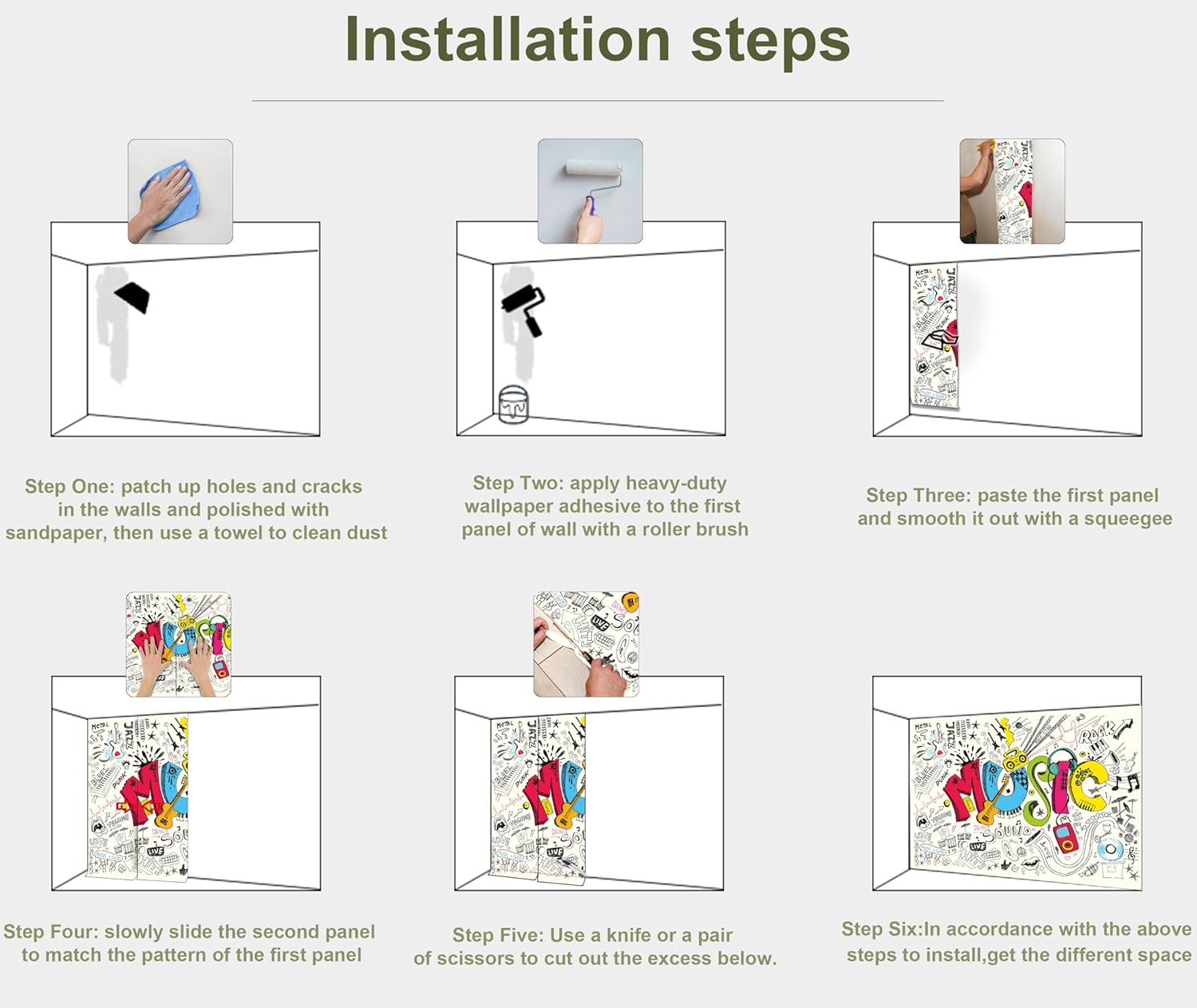 - INSTALLATION - 1.Fill in all cracks or holes and clean dust dirt and grease on the wall surface. 2. Apply the heavy duty wallpaper paste on the wall not mural. 3. Use a spirit level to mark first strip location. 4. match the pattern by sliding into place. 5.use a scraper to smooth out bubbles press. 6. Let dry for a few minutes and that's it! Please Note: Not self-adhesive. We recommend to use a standardized fleece wallpaper paste.