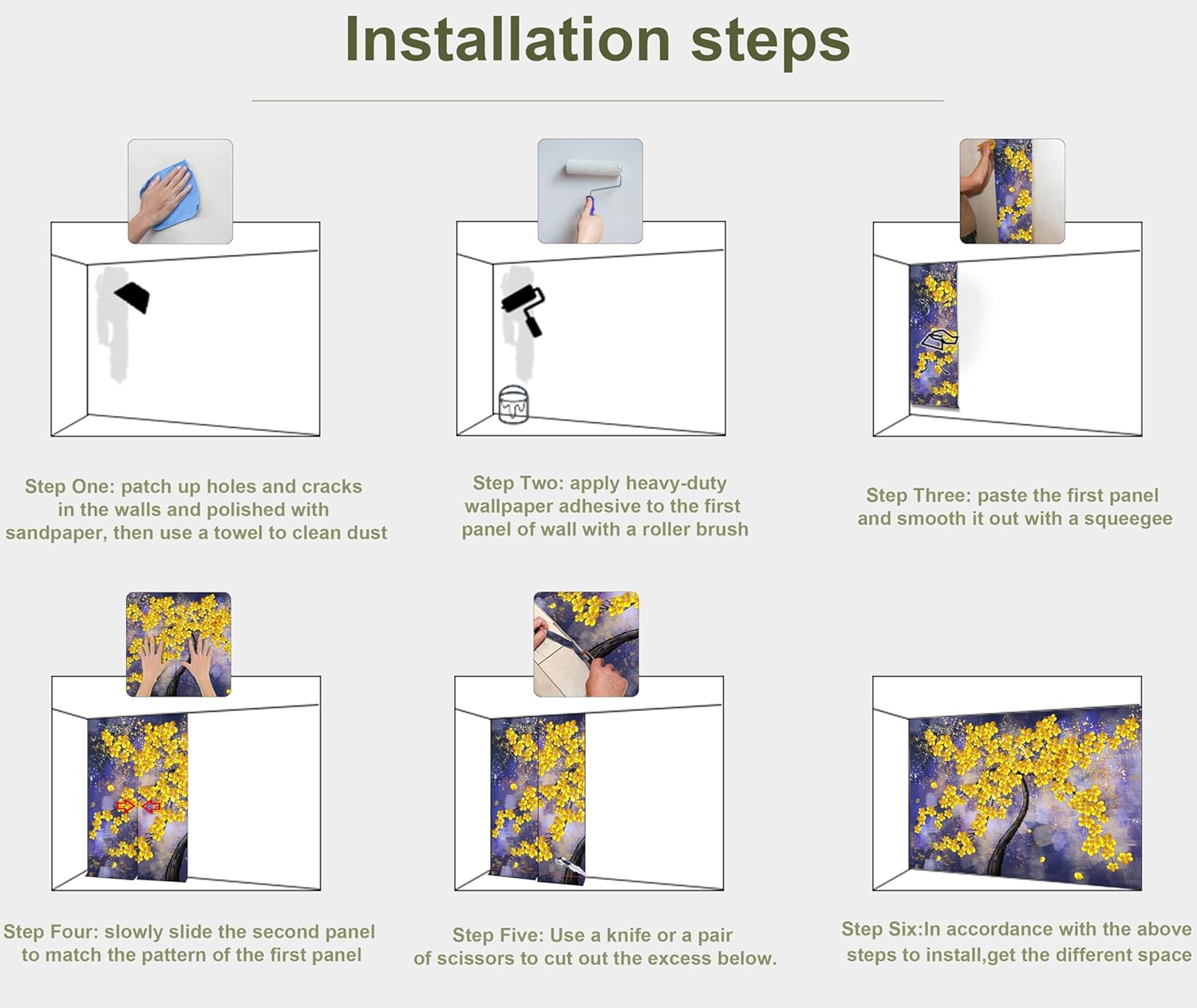 - INSTALLATION - 1.Fill in all cracks or holes and clean dust dirt and grease on the wall surface. 2. Apply the heavy duty wallpaper paste on the wall not mural. 3. Use a spirit level to mark first strip location. 4. match the pattern by sliding into place. 5.use a scraper to smooth out bubbles press. 6. Let dry for a few minutes and that's it! Please Note: Not self-adhesive. We recommend to use a standardized fleece wallpaper paste.