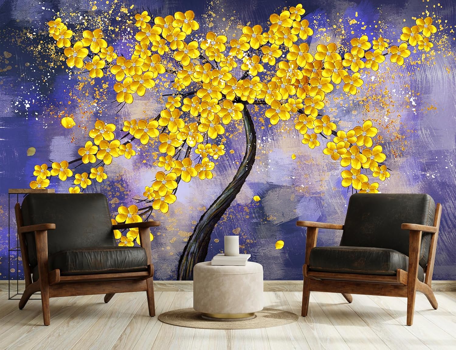 Yellow Flower Tree Wall Mural Purple Background Wall Decor for Bedroom Livingroom(Not Peel and Stick)