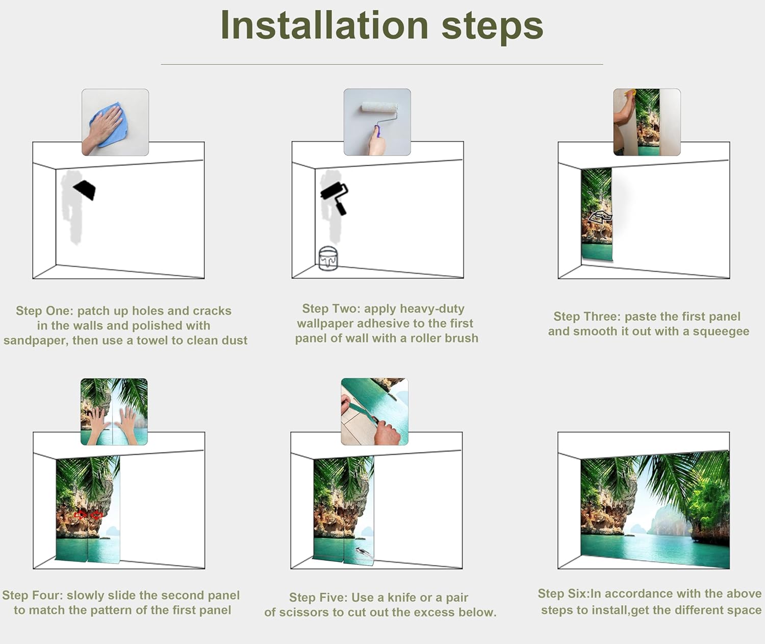 - INSTALLATION - 1.Fill in all cracks or holes and clean dust dirt and grease on the wall surface. 2. Apply the heavy duty wallpaper paste on the wall not mural. 3. Use a spirit level to mark first strip location. 4. match the pattern by sliding into place. 5.use a scraper to smooth out bubbles press. 6. Let dry for a few minutes and that's it! Please Note: Not self-adhesive. We recommend to use a standardized fleece wallpaper paste.